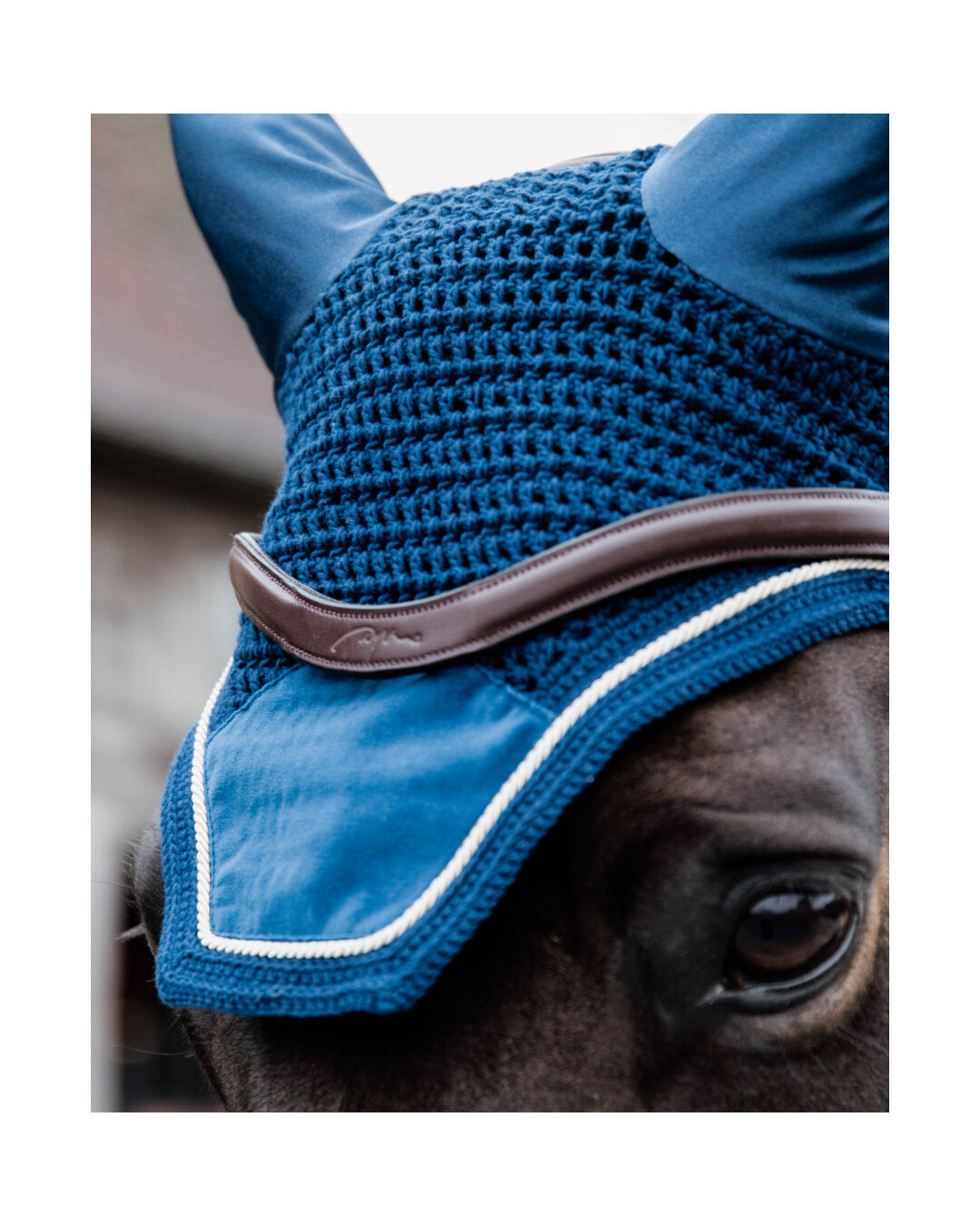 Die edlen Samt-Details verleihen deinem Pferd einen eleganten Look, während das dehnbare Material um die Ohren für optimalen Tragekomfort sorgt. Dank des verlängerten Genickstücks bleibt die Haube sicher an Ort und Stelle, selbst bei intensiven Ausritten.