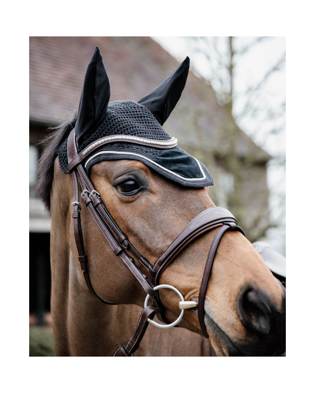 Die edlen Samt-Details verleihen deinem Pferd einen eleganten Look, während das dehnbare Material um die Ohren für optimalen Tragekomfort sorgt. Dank des verlängerten Genickstücks bleibt die Haube sicher an Ort und Stelle, selbst bei intensiven Ausritten.