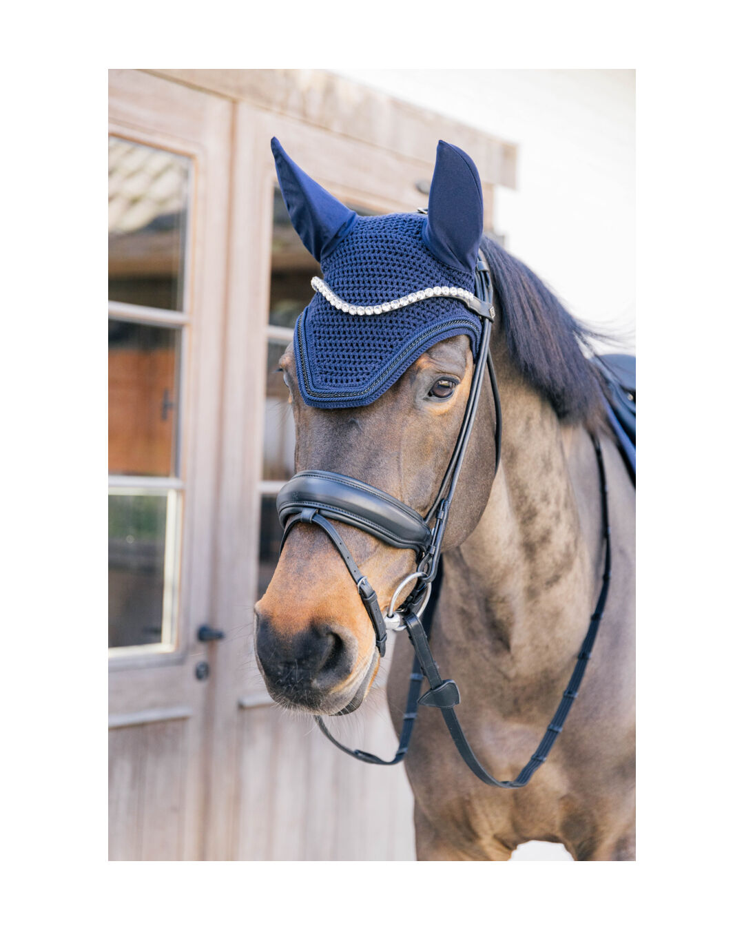 Die Fliegenhaube ist in den klassischen Farben Black und Navy erhältlich und bietet mit den dehnbaren, schmal geschnittenen Ohren sowie dem verlängerten Nackenbereich eine hervorragende Passform, die ein Verrutschen verhindert. Die hochwertigen Materialien garantieren Langlebigkeit und Komfort, sodass dein Pferd sich rundum wohlfühlt.