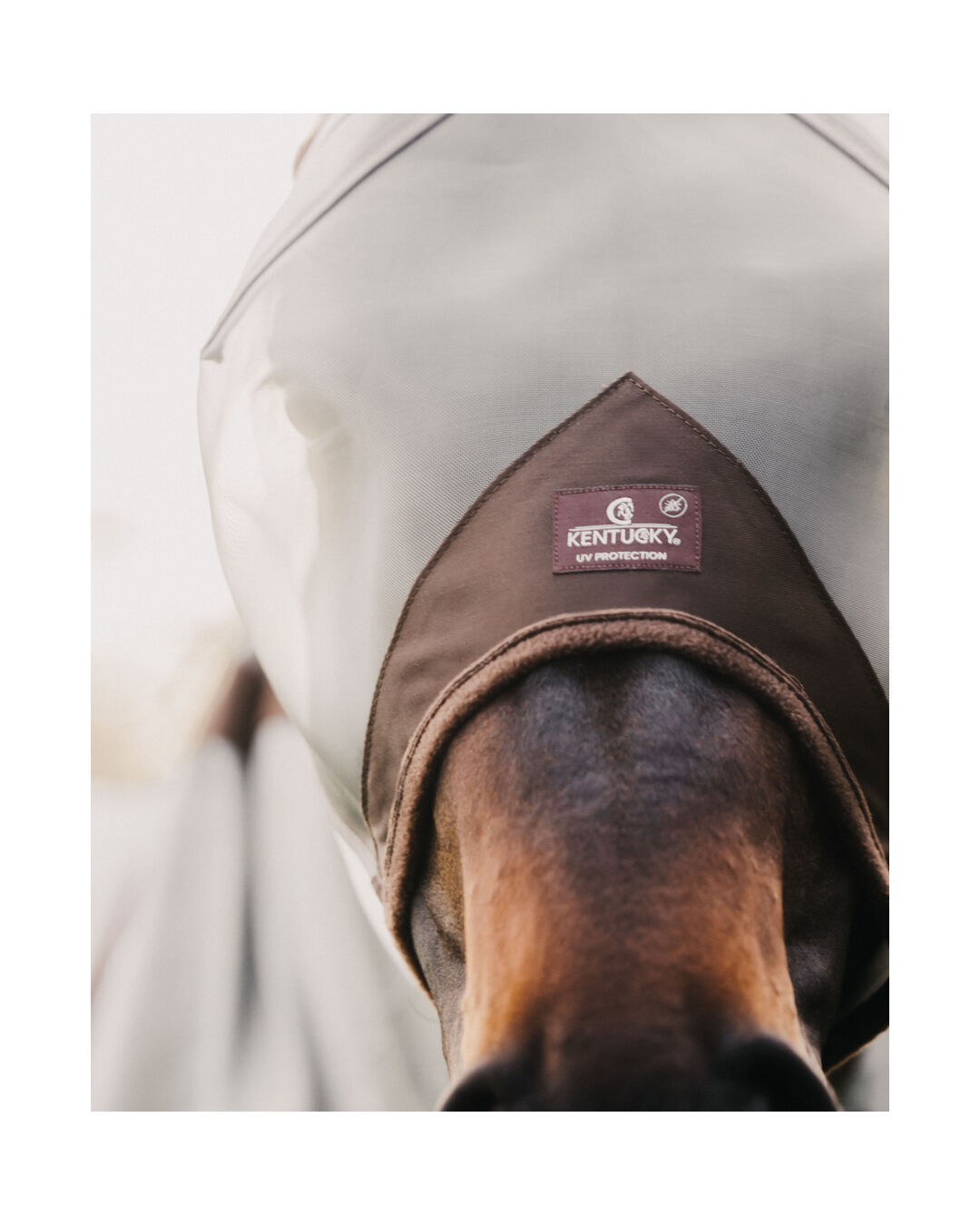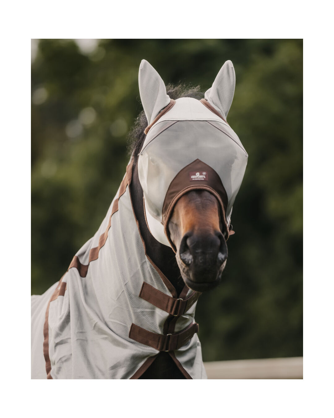 Das atmungsaktive Mesh-Gewebe blockiert nicht nur Insekten, sondern bietet auch 100 % UV-Schutz – ideal für lichtempfindliche Pferde oder sonnige Tage. Die Ohren sind aus strapazierfähigem Fliegenstrick gefertigt, sodass auch in diesem Bereich nichts durchkommt.