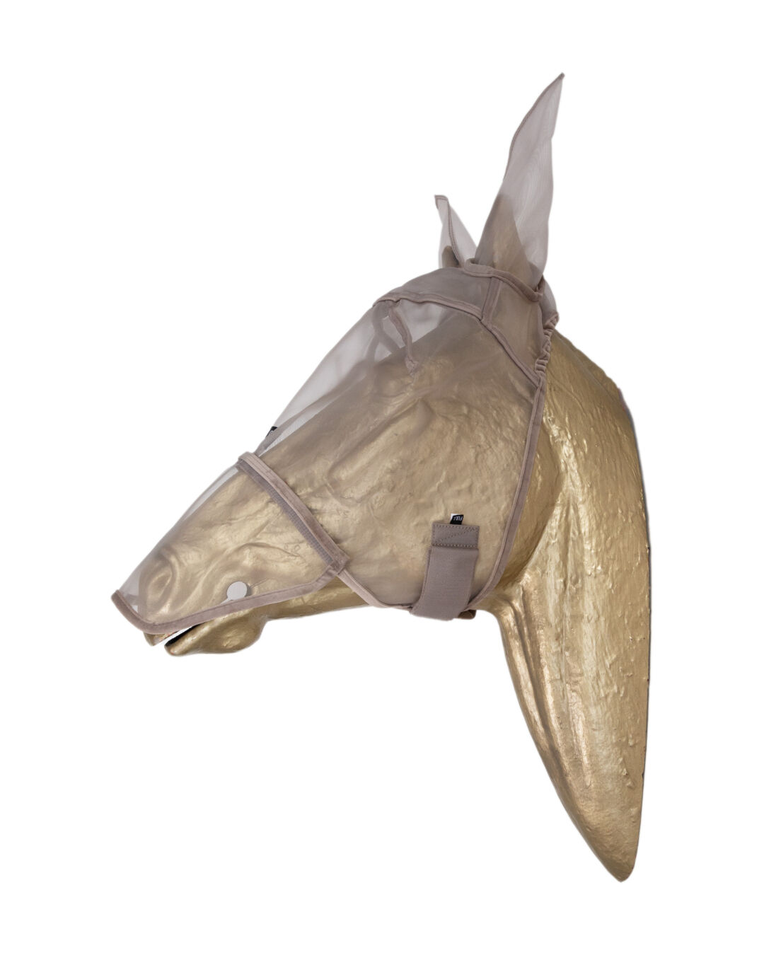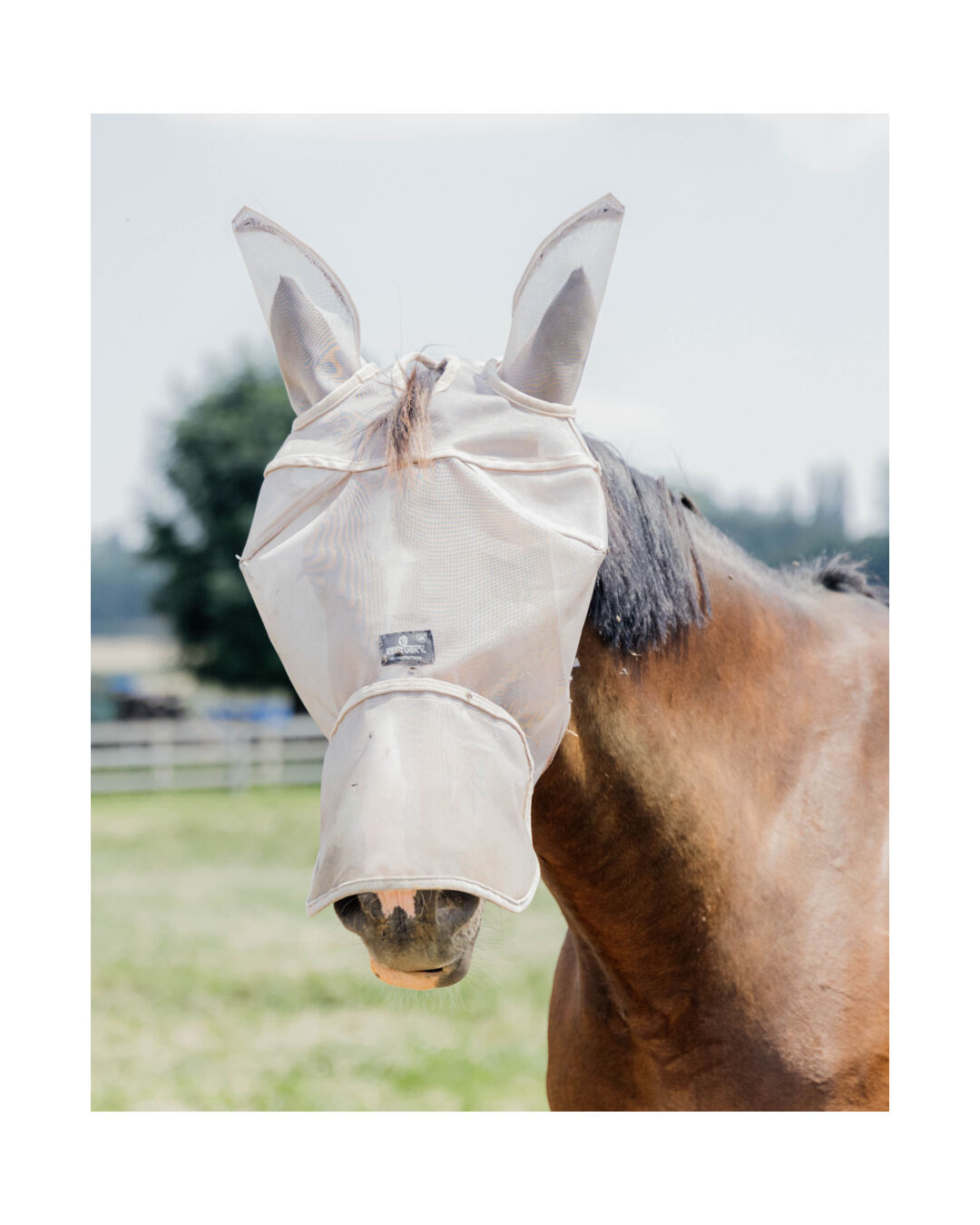 Die Ohren bestehen aus stabilem Fliegenstrick, der auch hartnäckigen Insekten keine Chance lässt. Der abnehmbare Nüsternschutz ist per Klettverschluss fixiert – so kannst du flexibel entscheiden, wie viel Schutz dein Pferd gerade braucht.