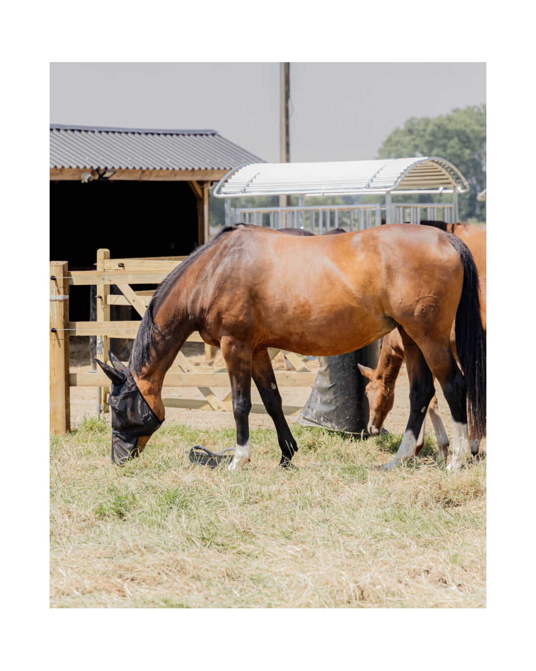 Ein starker Klettverschluss unterhalb des Kiefers sorgt für sicheren Halt – auch bei dauerhaftem Weidegang. Die Maske ist weich eingefasst, scheuerfrei und angenehm leicht – dein Pferd kann sie problemlos den ganzen Tag tragen.