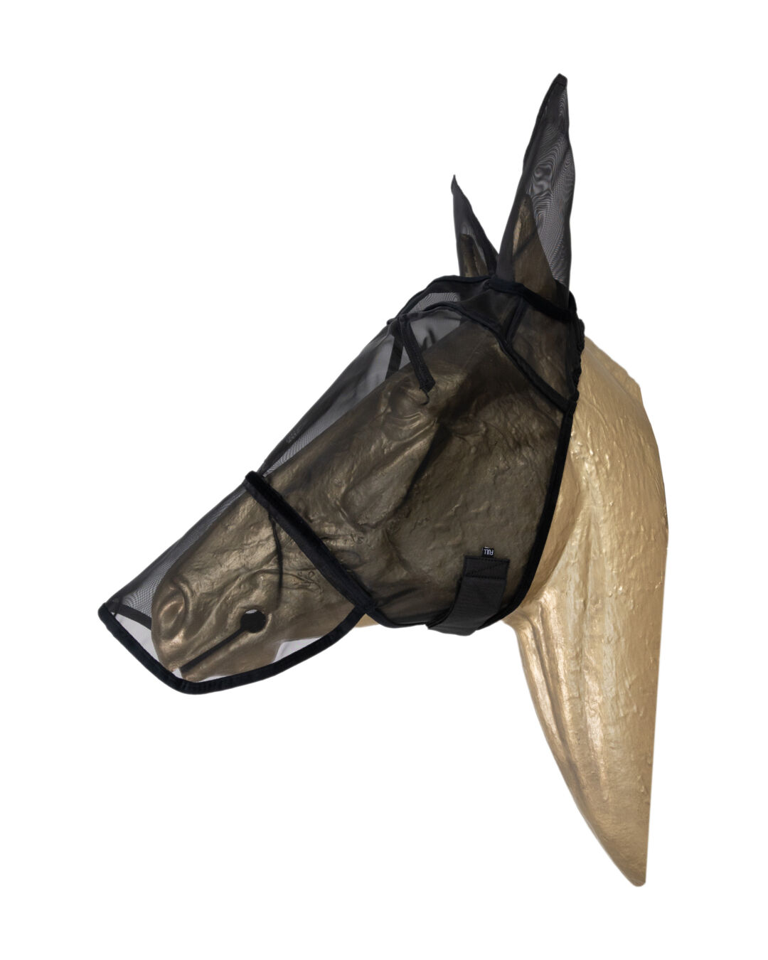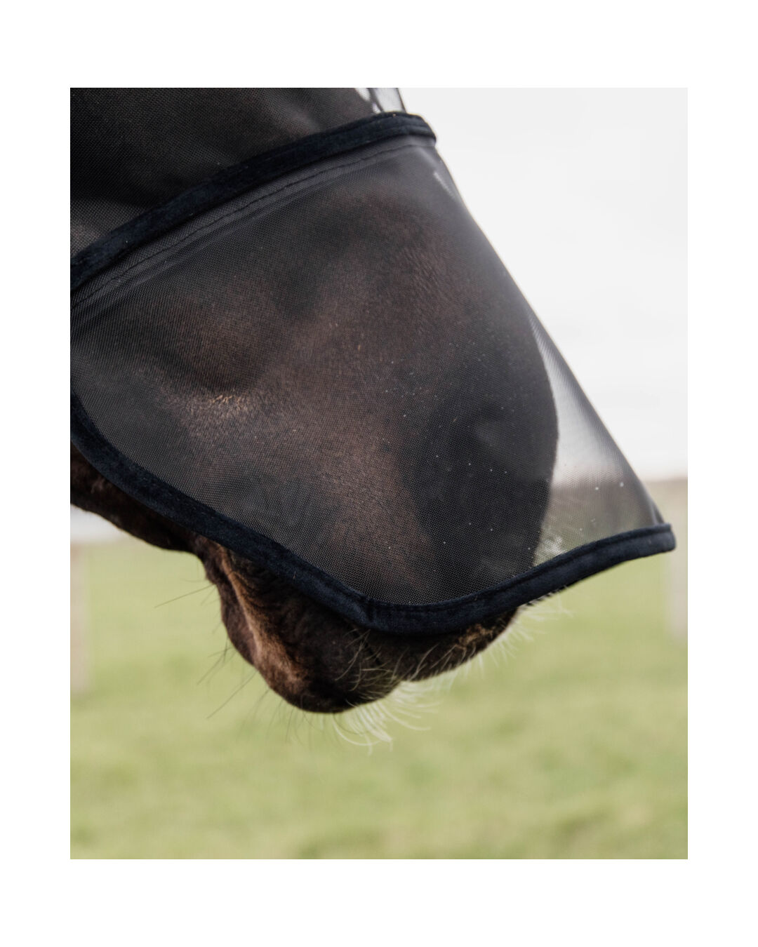 Die Ohren bestehen aus stabilem Fliegenstrick, der auch hartnäckigen Insekten keine Chance lässt. Der abnehmbare Nüsternschutz ist per Klettverschluss fixiert – so kannst du flexibel entscheiden, wie viel Schutz dein Pferd gerade braucht.