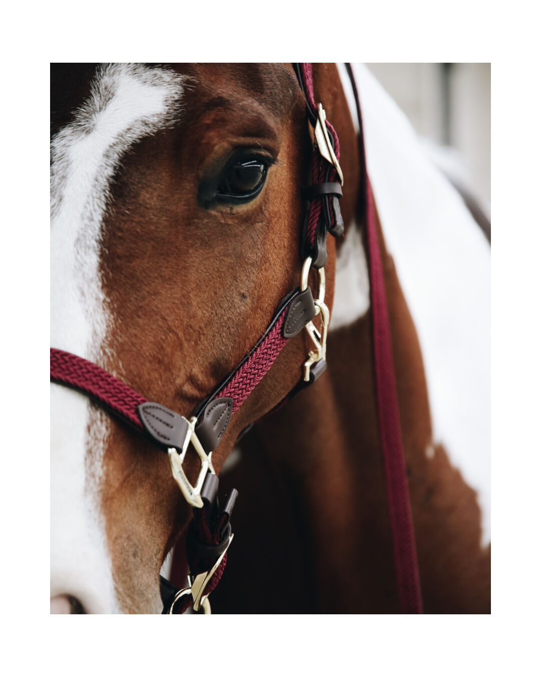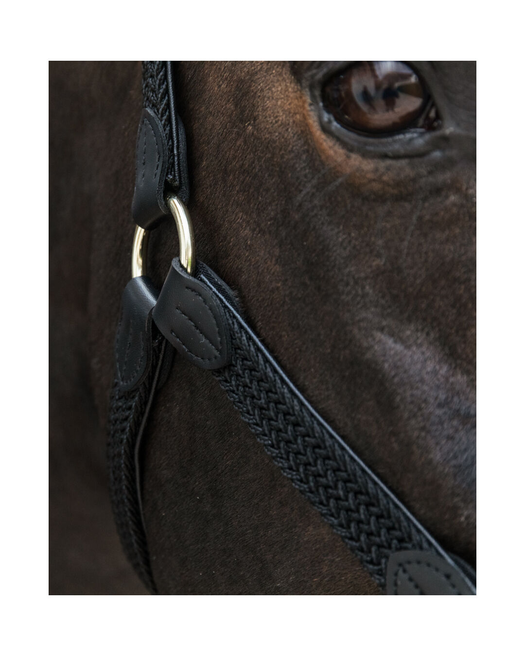 Das geflochtene Nylon verleiht dem Halfter eine edle Optik, während die goldenen Beschläge für einen Hauch von Luxus sorgen. Dank der verstellbaren Schnallen am Kinn und an der Seite kannst du die Passform individuell an dein Pferd anpassen. Der Stift der Schnalle lässt sich flexibel im geflochtenen Nylon befestigen, was eine optimale Anpassung ermöglicht.