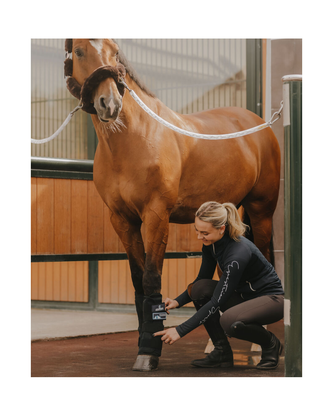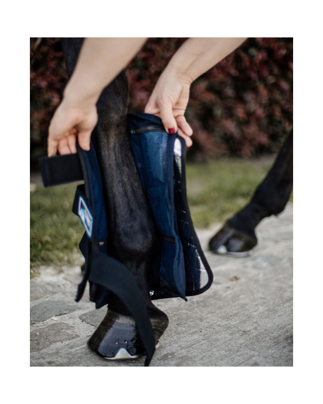 Diese anatomisch geformten Kühlgamaschen werden paarweise verkauft und sind mit einem weichen, offenen Strickgewebe mit Silikonbändern versehen, sodass sie schön an den Beinen des Pferdes sitzen bleiben. Die Gamaschen sind speziell dafür entwickelt, Schmerzen zu lindern, Schwellungen zu reduzieren und die Durchblutung zu fördern. Die herausnehmbaren Cryo-Gel Pads sorgen dafür, dass die Kälte für 30 bis 40 Minuten gespeichert wird – ideal für eine effektive Regeneration. Sie sollten vor der Nutzung 3 Stunden oder länger im gefrierschrank gelagert werden.