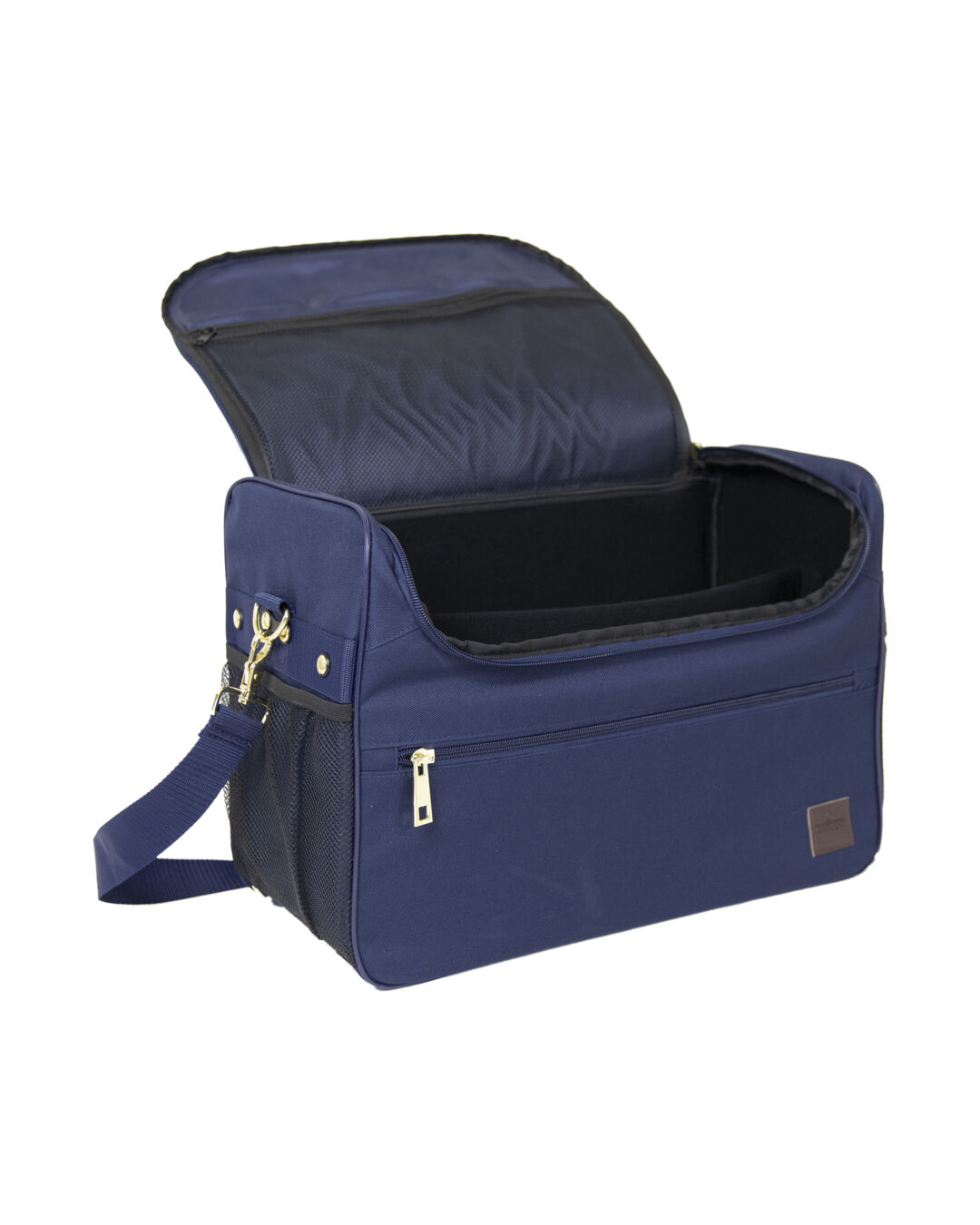 Der abnehmbare Trageriemen mit Schulterpolster ermöglicht dir einen bequemen Transport, egal ob zum Stall oder auf Reisen. Dank der stabilen Füßchen am Boden bleibt die Tasche stets aufrecht stehen. Sollte sie einmal schmutzig werden, lässt sie sich einfach mit einem feuchten Tuch reinigen.