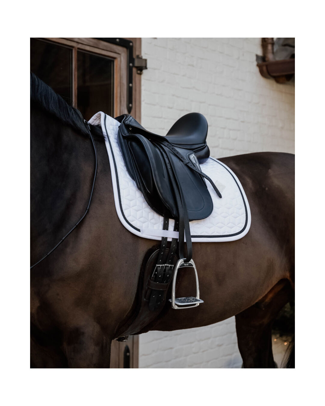 Diese edle Sattelunterlage kombiniert stilvolles Design mit praktischer Funktionalität. Die einzigartige Sternsteppung und die dezente Glitzerkordel verleihen deinem Pferd einen eleganten Look, der auf jedem Turnier oder Ausritt zum Hingucker wird.
