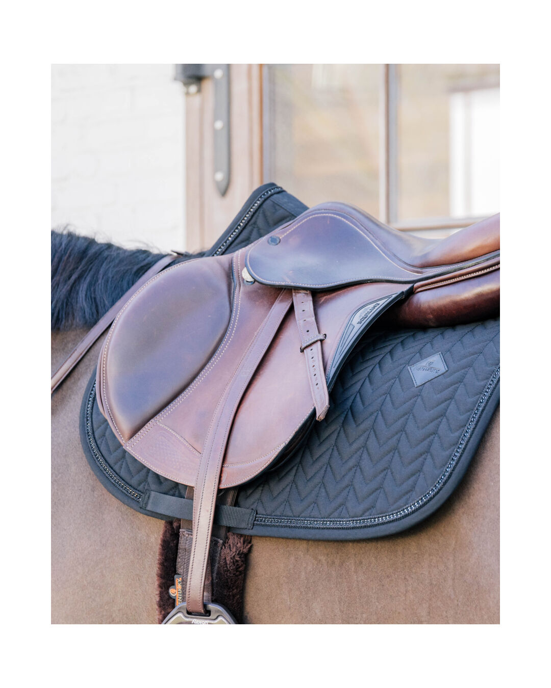 Diese Sattelunterlage ist nicht nur ein echter Hingucker, sondern auch ein zuverlässiger Begleiter für dein Pferd. Das Design besticht durch eine einzigartige Steppung und eine glitzernde Umrandung, die deinem Pferd einen stilvollen Auftritt garantiert. Dank des praktischen Nylonriemens zur Befestigung am Gurt gehört das lästige Strippen der Vergangenheit an. So sitzt die Schabracke fest und sicher, ohne zusätzlichen Aufwand.
