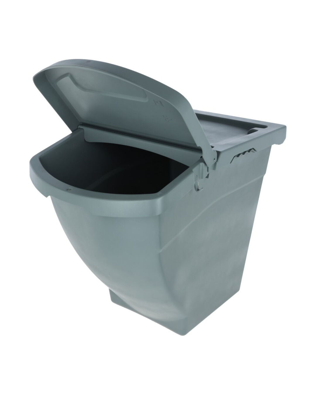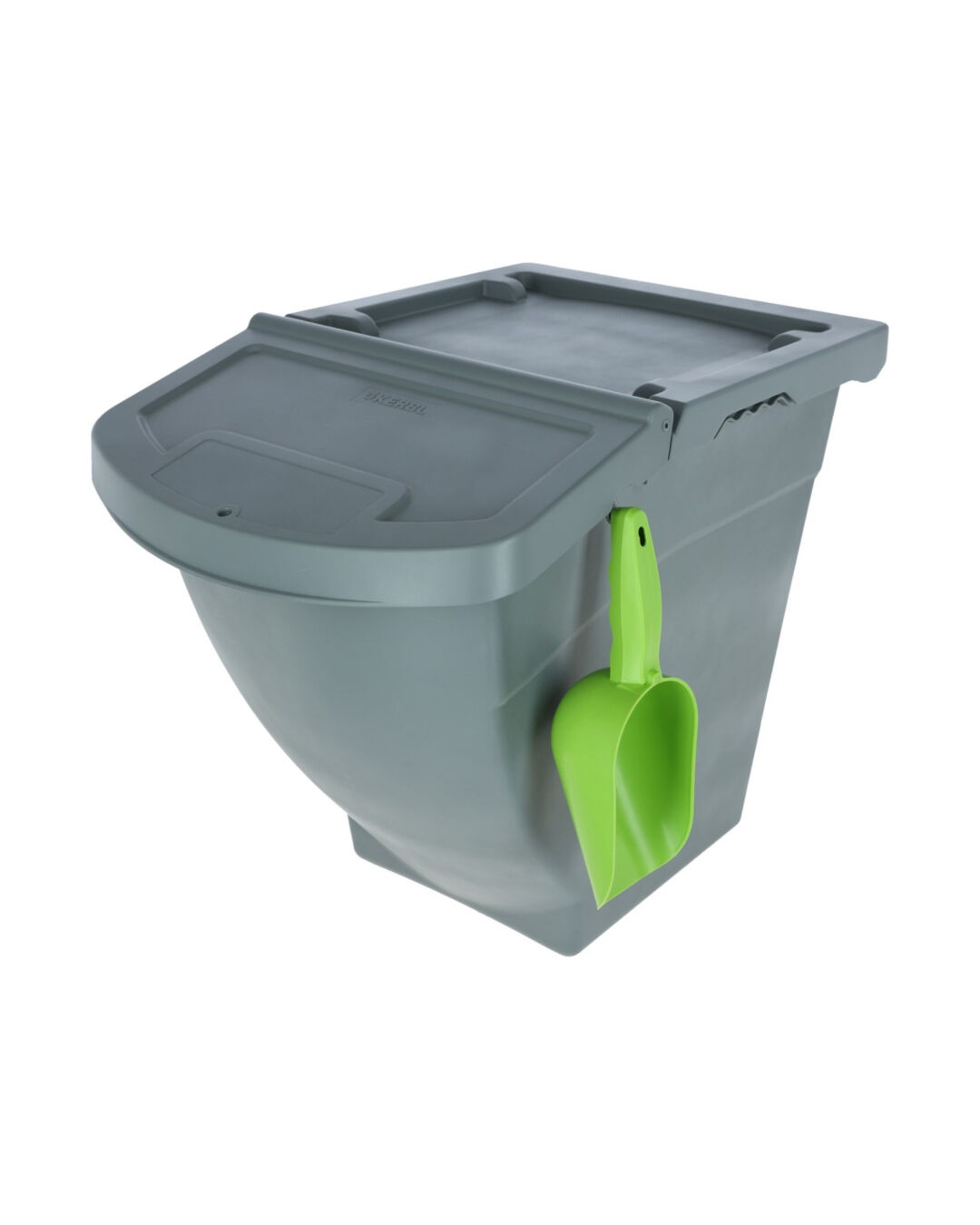 Neben der praktischen Handhabung bietet die Box auch einen durchdachten Diebstahlschutz: Im verschlossenen Zustand kann der Deckel nicht von der Rückseite angehoben werden. Zudem ist er mit einem Vorhängeschloss verschließbar – ideal für Stall, Hof oder Garten. Eine seitliche Halterung für eine Futterschaufel sorgt für zusätzlichen Komfort. Die abgebildete Futterschaufel ist nicht Teil des Lieferumfangs.
