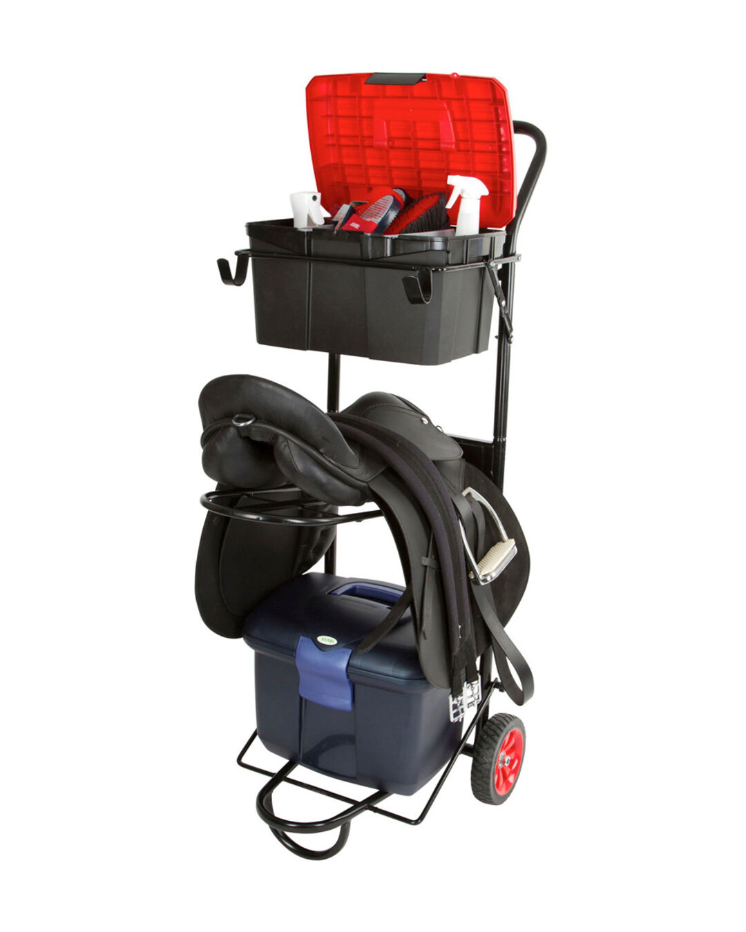 Seine fahrbare und klappbare Konstruktion macht ihn zu einem praktischen Helfer im Stall, auf Turnieren und bei anderen Reitveranstaltungen unterwegs. Mit den Maßen des Putzboxrahmens von 38 cm in der Breite und 28 cm in der Tiefe, sowie einer Breite von 48 cm, einer Höhe von 127 cm und einer Tiefe von 78 cm, bietet der Sattelwagen genügend Raum für das Wesentliche, bei einem Gewicht von 15 kg.