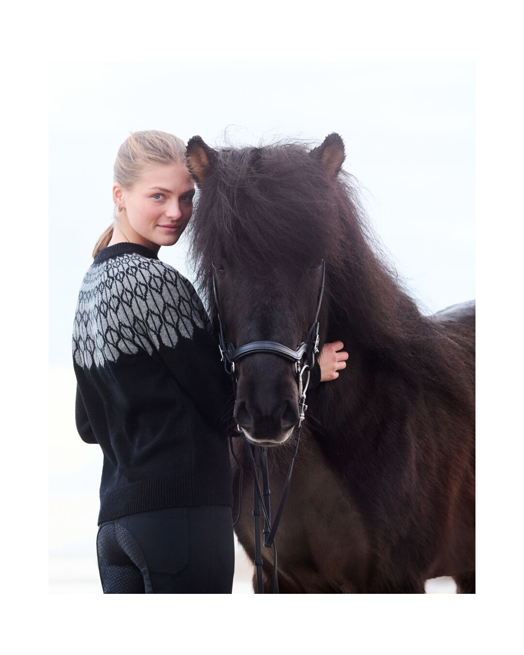Mit seiner isländisch inspirierten Passe hat er diesen ganz besonderen Look, der sofort Wärme, Tradition und Eleganz ausstrahlt. Ob beim Ausritt, im Stall oder einfach an einem kühlen Tag draußen – Magda sorgt dafür, dass du dich wohlfühlst, ohne auf Stil zu verzichten. Das Strickmaterial ist angenehm wärmend, dabei robust genug für den Alltag im Reiterleben und gleichzeitig so schön, dass du ihn auch abseits vom Stall locker tragen kannst.