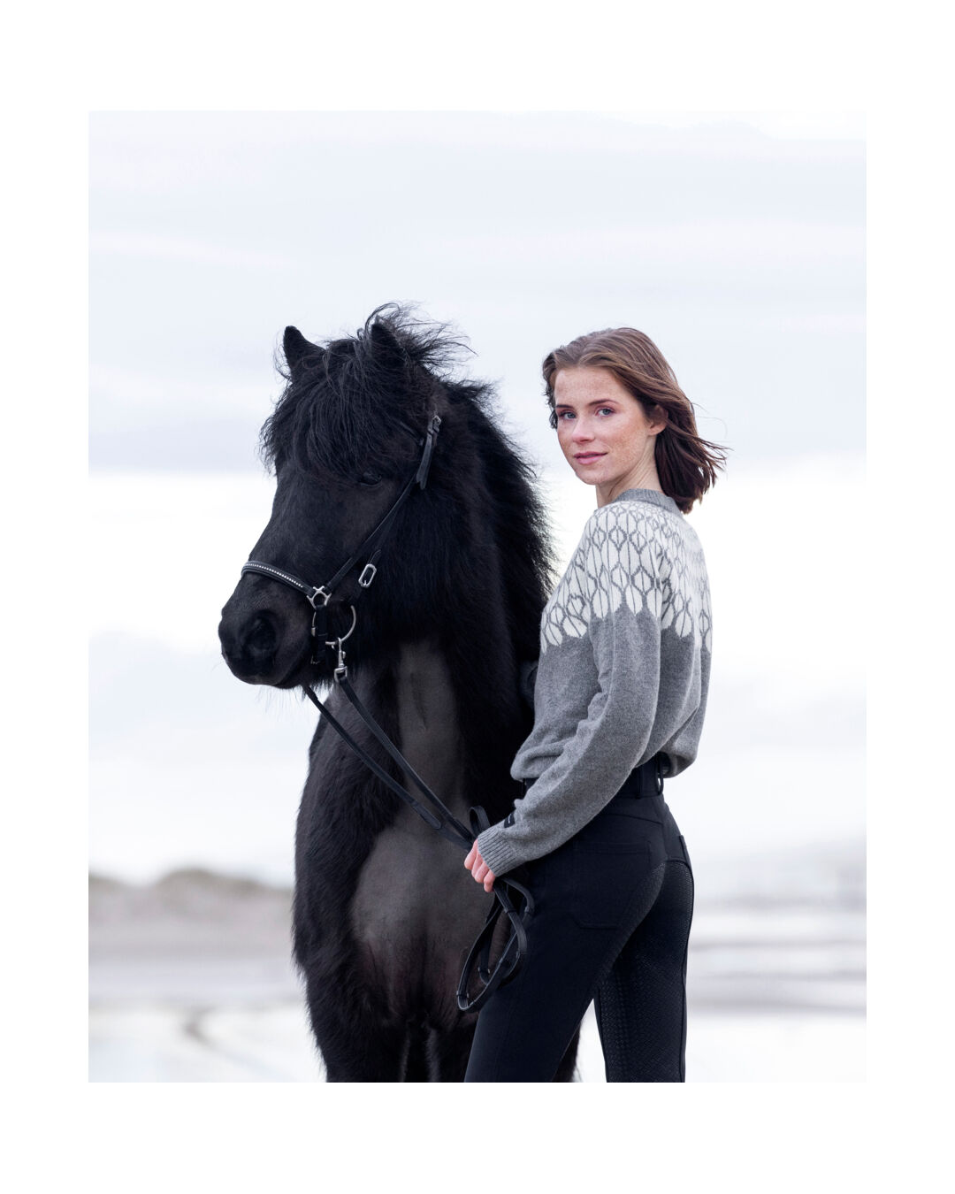 Mit seiner isländisch inspirierten Passe hat er diesen ganz besonderen Look, der sofort Wärme, Tradition und Eleganz ausstrahlt. Ob beim Ausritt, im Stall oder einfach an einem kühlen Tag draußen – Magda sorgt dafür, dass du dich wohlfühlst, ohne auf Stil zu verzichten. Das Strickmaterial ist angenehm wärmend, dabei robust genug für den Alltag im Reiterleben und gleichzeitig so schön, dass du ihn auch abseits vom Stall locker tragen kannst.