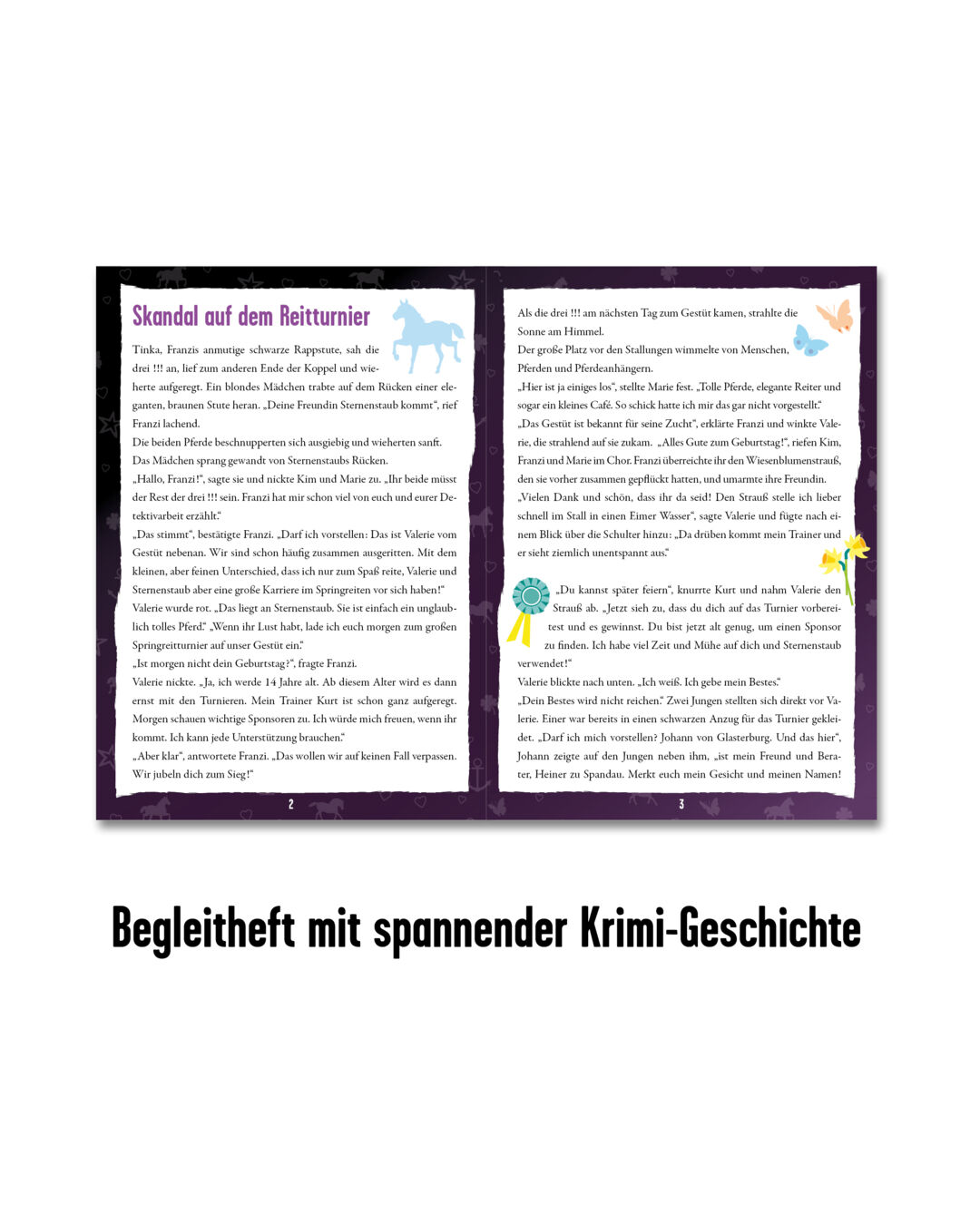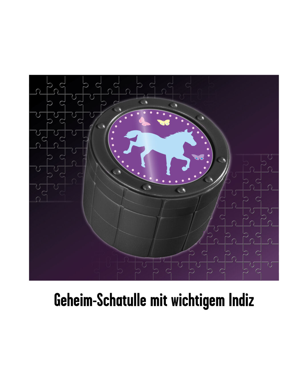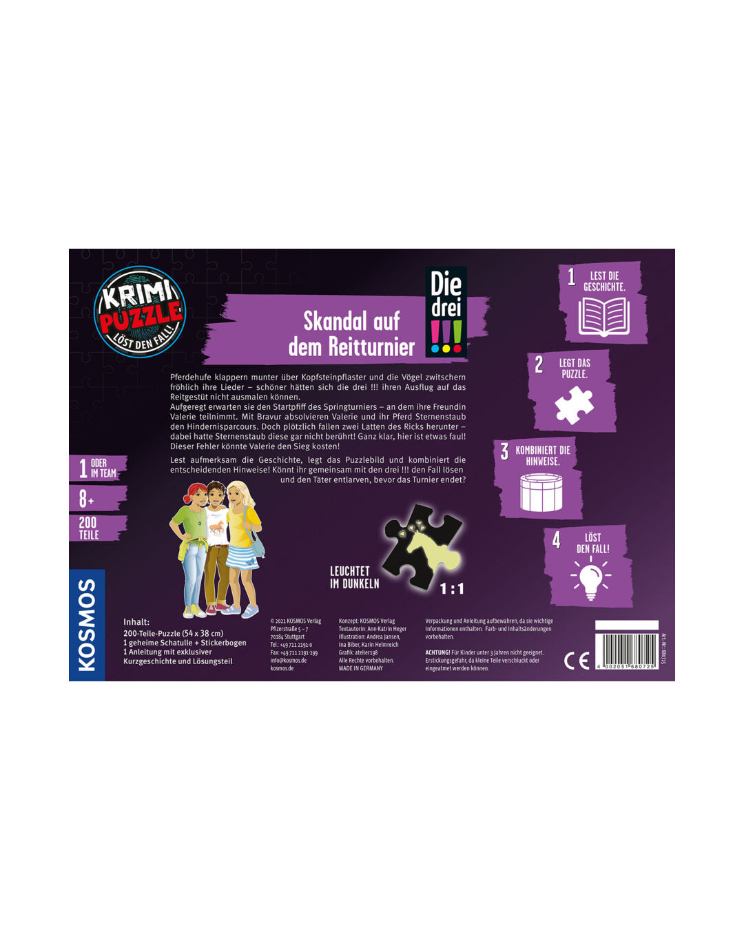 In diesem interaktiven Puzzle-Abenteuer sind junge Detektivinnen und Detektive ab 8 Jahren gefragt, mysteriöse Vorfälle auf einem Reitturnier zu untersuchen. Während des Puzzelns der 200 Teile, die im Dunkeln leuchten, entdeckt man Hinweise und löst gemeinsam mit den drei !!! Kim, Franzi und Marie den Fall.