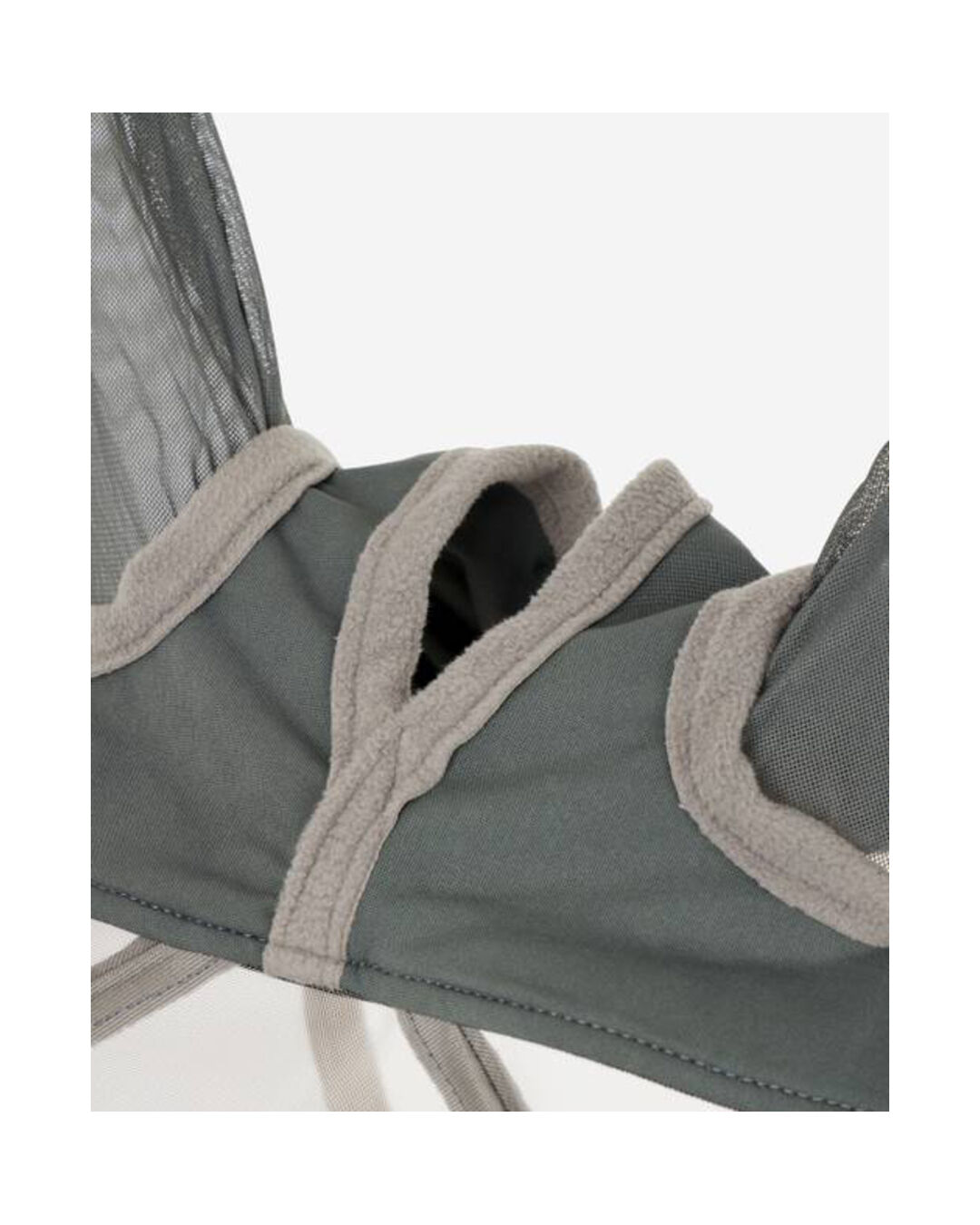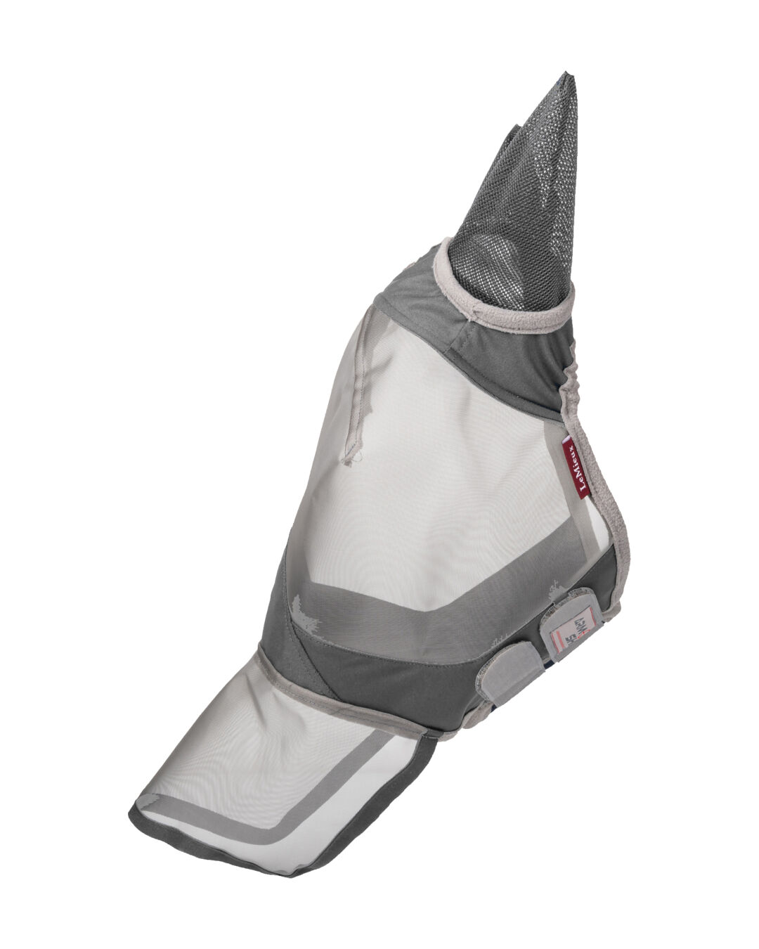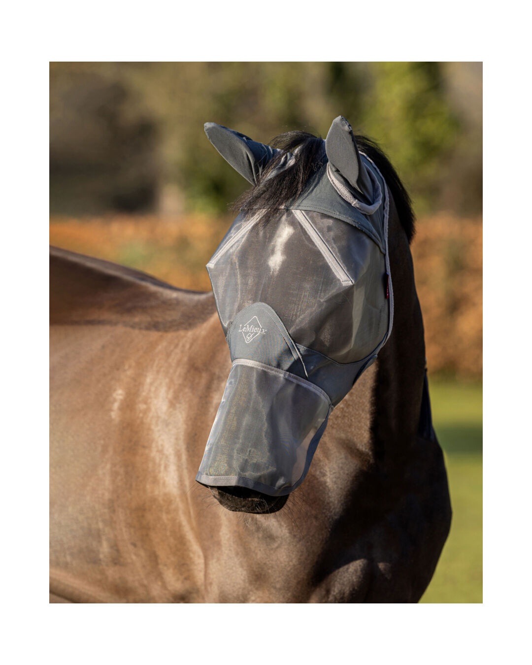 Die Fliegenmaske zeichnet sich durch eine breitere Passform über den Augenmuscheln, um die Wangen und über dem Kopfteil aus. Dies gewährleistet einen größeren Abstand zum Gesicht des Pferdes und bietet dadurch mehr Abdeckung. Das robuste, silberne Netzmaterial bietet 75 % UV-Schutz und schützt somit effektiv vor Fliegen, während es gleichzeitig eine klare und ungehinderte Sicht ermöglicht.