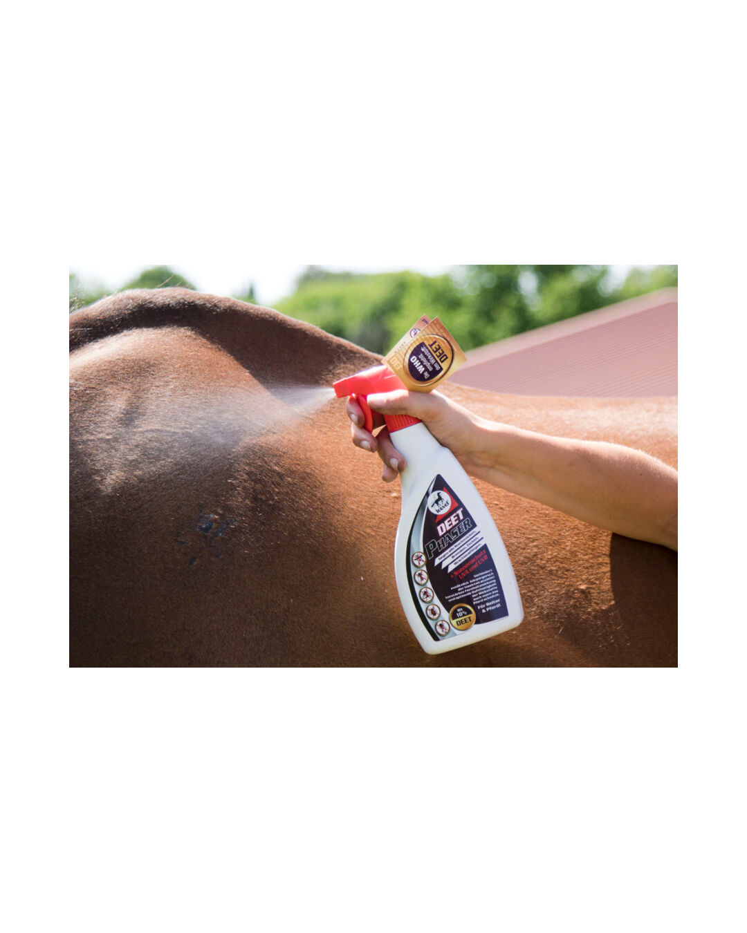 Ein zusätzliches Feature des DEET Phasers ist der Geruchsschutz durch Zitronensäureester, der den Körpergeruch, der Insekten anzieht, neutralisiert. Schweißgeruch wird so effektiv gemindert. Darüber hinaus enthält das Spray auch Citriodoraöl aus Zitroneneukalyptus, das als natürliches Insektenabwehrmittel wirkt. Der DEET Phaser bietet zudem Sonnenschutz (UV-A und UV-B), was besonders für Pferde wichtig ist, da bestimmte Bereiche wie Rücken und Kruppe anfällig für UV-Strahlung sind.