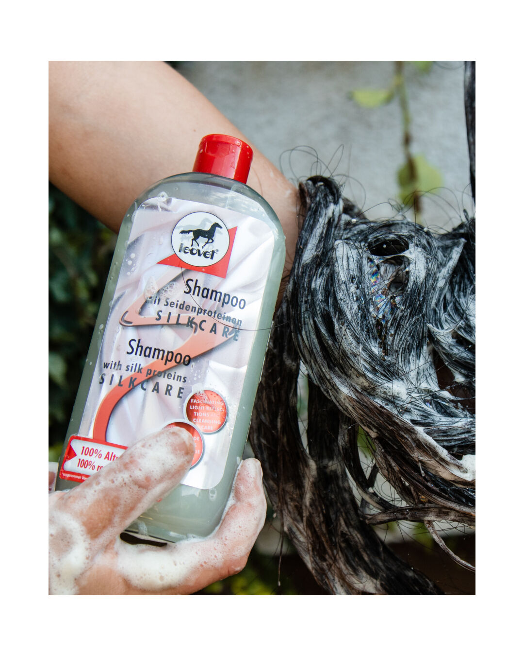 Das Shampoo Silkcare bietet eine pflegende Reinigung mit hochwertigen Seidenproteinen, die sich schon bei der Anwendung mit Haut und Haar verbinden. Diese Seidenproteine unterstützen die Haarstruktur, sorgen für Glanz und Geschmeidigkeit, und verleihen dem Fell deines Pferdes eine gesunde und gepflegte Erscheinung. Zusätzlich pflegen pflanzliche Stoffe und Vitamine das Haar nachhaltig, sodass es kräftig und vital bleibt.