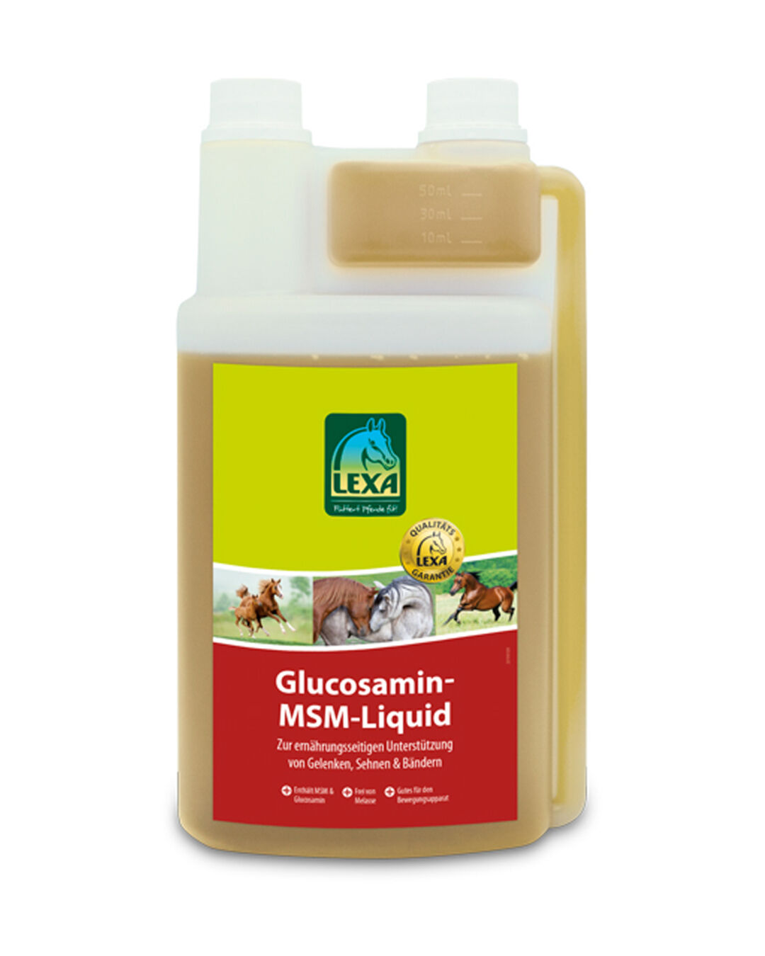 LEXA Glucosamin-MSM-Liquid enthält Methylsulfonylmethan als Schwefelquelle sowie Glucosamin und eignet sich zur Unterstützung für den Bewegungsapparat. Das Produkt ist frei von Melasse und eignet sich aufgrund der flüssigen Formulierung besonders bei Pferden, die die Aufnahme von Pellets verweigern.