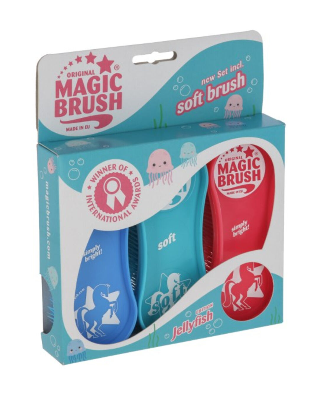 Jellyfish: Mit dem Jellyfish-Set erhält das Fell deines Pferdes eine strahlend gepflegte Ausstrahlung. Das Set besteht aus zwei klassischen MagicBrush-Bürsten im exklusiven Jellyfish-Design und einer Softbrush für empfindliche Bereiche. Die Spezialborsten garantieren eine effiziente Reinigung und einen angenehmen Massageeffekt, und das Set eignet sich perfekt für die Pflege des gesamten Pferdes.