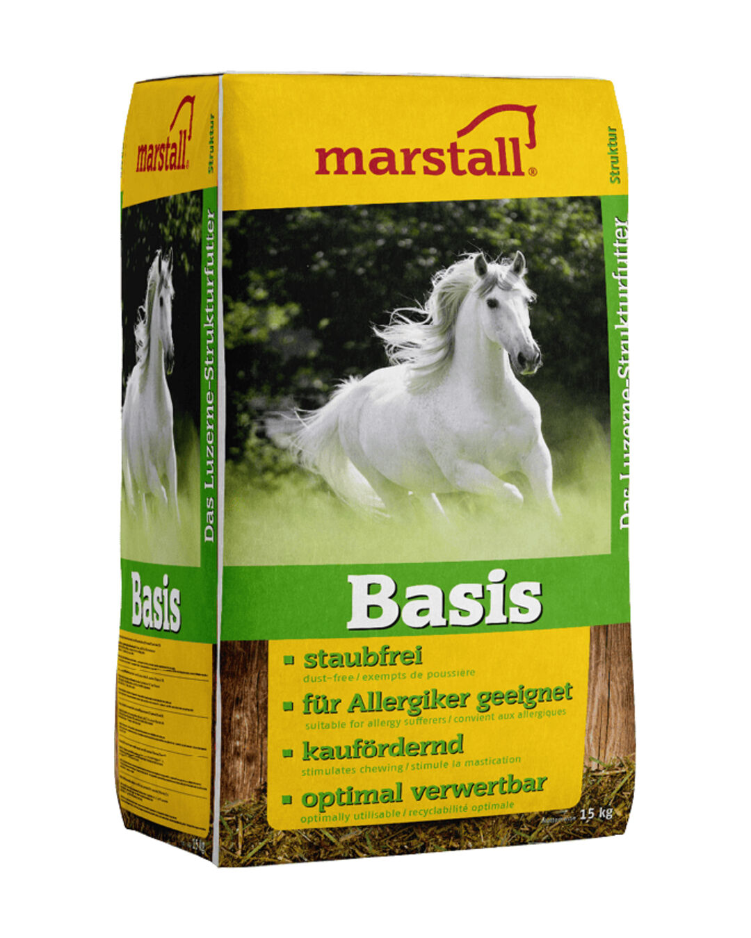 marstall Basis ist aus gehäckselten Stroh- und Luzernefasern zusammengesetzt. Diese Kombination sorgt für eine Anregung der Kautätigkeit und damit eine gesteigerte Speichelproduktion, die die Verwertbarkeit des Futters verbessert. Die eiweißreiche Luzerne, angereichert mit Melasse und Pflanzenöl, macht marstall Basis zu einer ausgezeichneten Rohfaserquelle. Melasse ist reich an Vitaminen, Mineralien und Spurenelementen, während das Pflanzenöl wertvolle Omega-3-Fettsäuren liefert.
