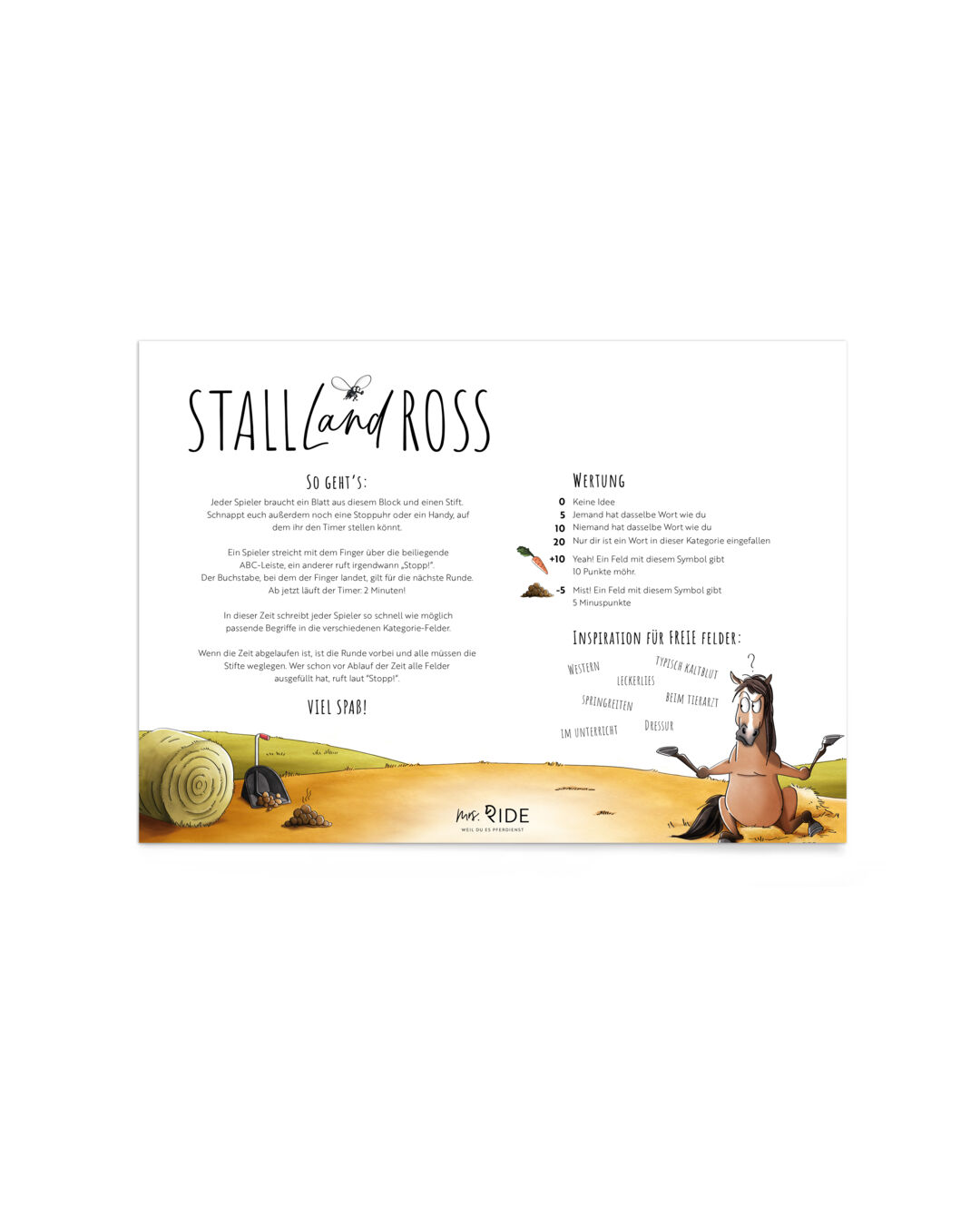 Mit dem Spielblock Stall Land Ross von mrs. Ride bringst du Pferdespaß aufs Papier – egal ob im Stall, beim Reitercamp oder zu Hause auf dem Sofa.