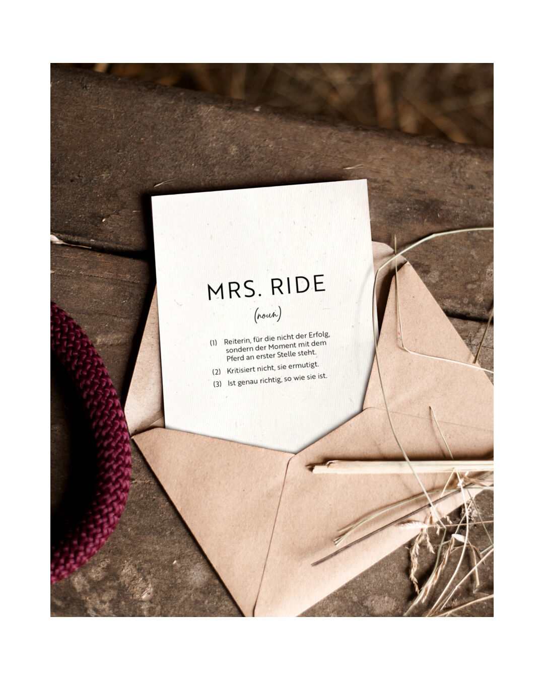 Ob für Stallfreunde, Reitbeteiligung, Hufschmied oder für dich selbst: mrs. RIDE® steht für originelle Geschenkideen, die immer für ein Schmunzeln sorgen. Mit einer Prise Humor, einer gesunden Portion Selbstironie und viel Liebe erinnern die einzigartigen Produkte täglich daran, das Reiterleben mit mehr Leichtigkeit zu genießen. Jedes Produkt wird liebevoll von Hand entworfen und regional in Deutschland hergestellt.