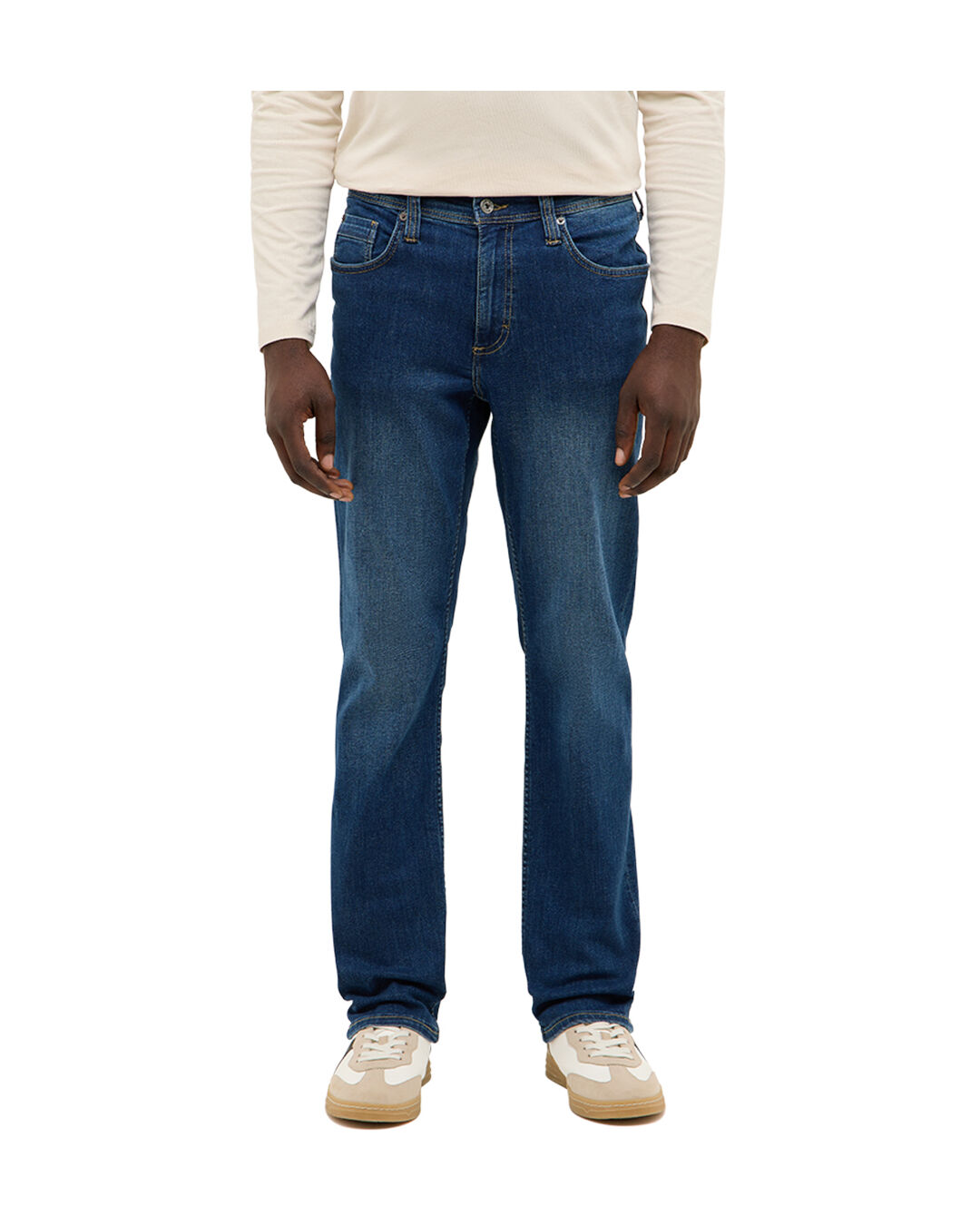 Mit mittelhohem Bund, körpernahem Schnitt und konischem Beinverlauf sitzt sie perfekt und sorgt für eine moderne, schlanke Silhouette. Kontrastnähte, Labelnieten und die dezente Waschung verleihen der Jeans den typischen Mustang-Charakter und machen sie zu einem vielseitigen Begleiter für Alltag und Freizeit.