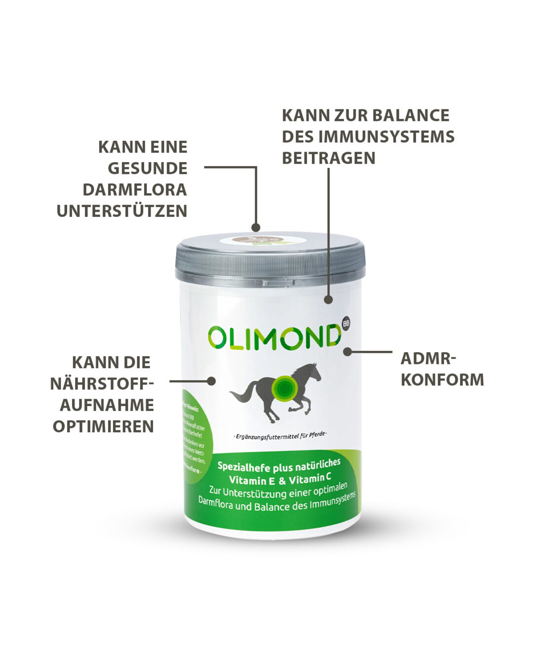 Olimond BB unterstützt durch inaktivierte Hefe und B-Vitaminen die Darmflora und das Immunsystem deines Lieblings. Der Vorteil zu anderen Hefeprodukten: Wichtige Stoffwechselprodukte müssen nicht erst im Magen gebildet werden, sondern sind bereits enthalten. Entdecke jetzt eine Auswahl an Olimond BB-Produkten bei uns im EQUIVA Store und Online und unterstütze die Gesundheit und das Wohlbefinden deines Pferdes.