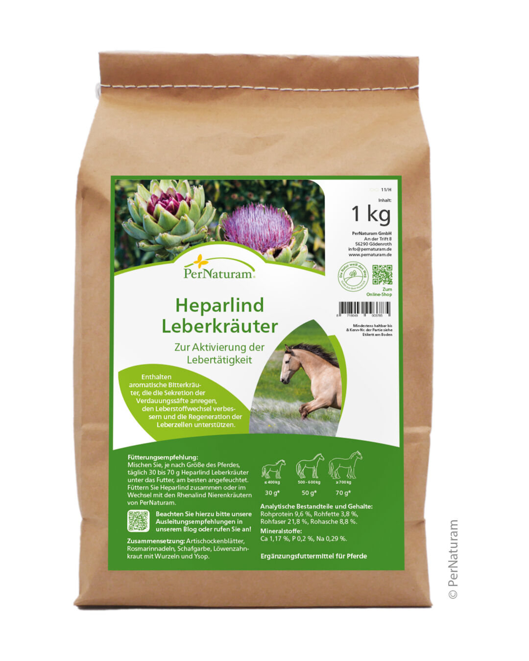 | Fütterungsmenge: | Mische, je nach Größe des Pferdes, täglich 30 bis 70 g Heparlind Leberkräuter unter das Futter, am besten angefeuchtet. Fütter Heparlind zusammen oder im Wechsel mit den Rhenalind Nierenkräutern von PerNaturam. |