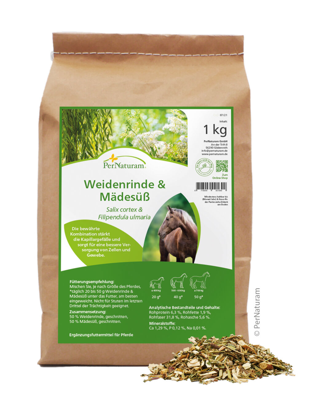 | Fütterungsmenge: | Mische, je nach Größe des Pferdes, eine Woche lang täglich 1 bis 3 gehäufte Esslöffel Weidenrinde & Mädesüß unter das Futter. Danach drei Tage Pause einlegen, dann wieder drei Tage geben. In diesem Rhythmus weiter bis maximal vier Wochen füttern. |