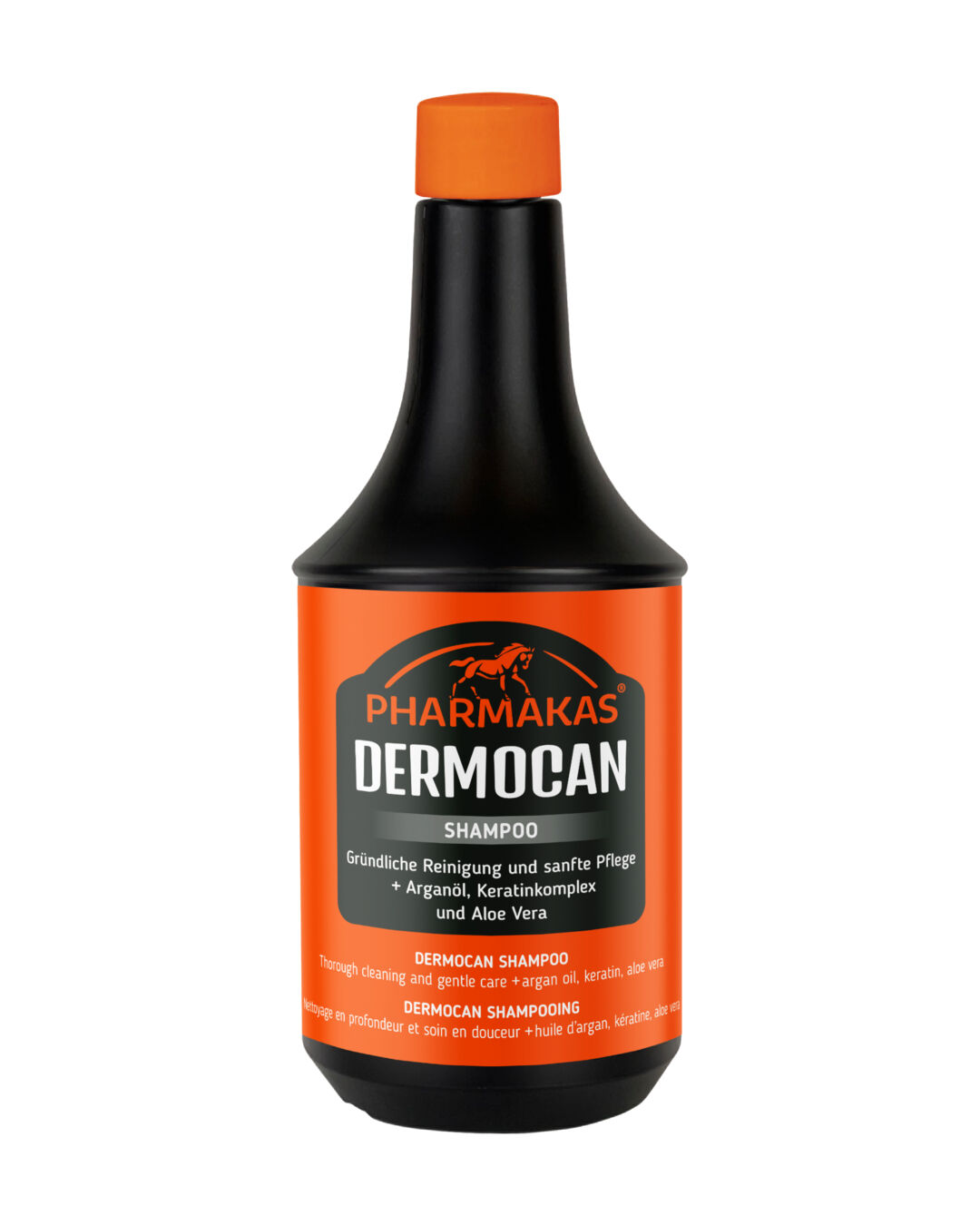 Das Shampoo Dermocan von Pharmakas bietet eine umfassende Lösung für die Pflege des Pferdefells.
