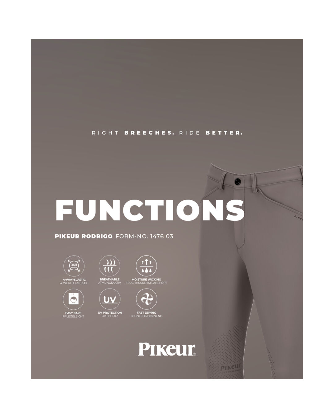 Die Passion für den Pferdesport sowie die gelebte enge Verbindung zum Spitzensport ermöglichen es Pikeur, den Ansprüchen von Hobby- und Profireitern gleichermaßen gerecht zu werden. Mit der Tradition und Erfahrung aus mehr als sechs Jahrzehnten steht PIKEUR beständig für Kompetenz, Qualität und ständige Innovationen auf Top-Niveau in der Reitbekleidung. Perfekte Passformen, hohe Langlebigkeit, Funktionalität und modischer Anspruch sind Attribute, die gleichwohl national wie auch international geschätzt werden. Mit dem umfangreichen Sortiment erlebst du professionelle Produkte der Marke PIKEUR, die jeden Tag ihre Qualität beweisen – ob im Training, in der Freizeit oder ebenso bei nationalen und internationalen Turnieren bis hin zu Championaten und Olympischen Spielen.