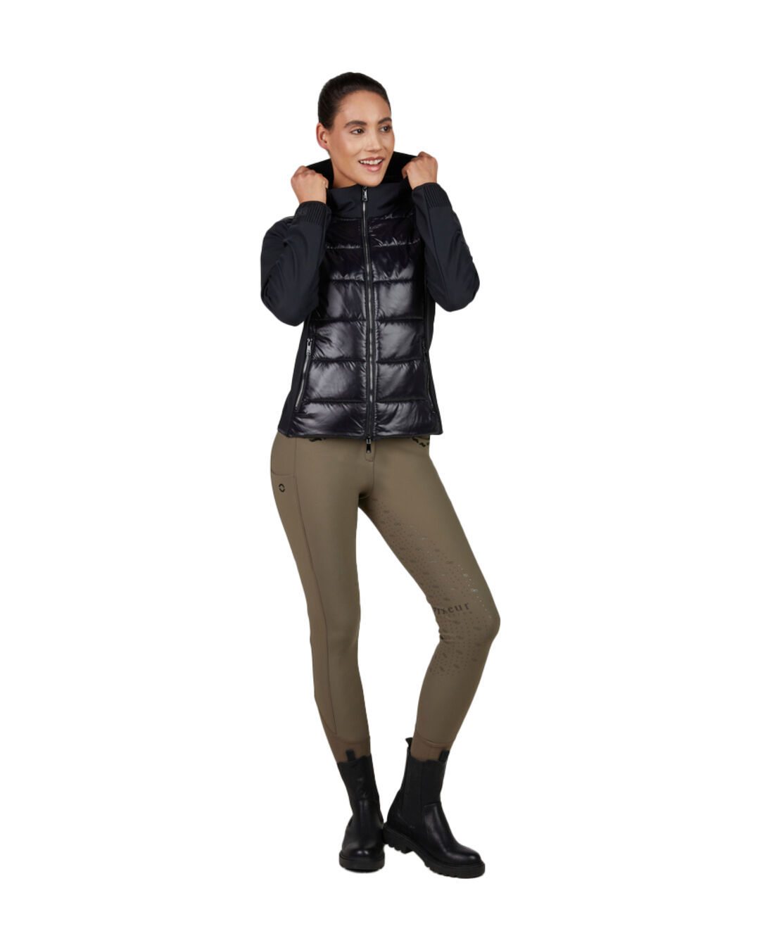 Die Kombination aus 4-Way-Stretch-Softshell mit samtig angerauter Innenseite und glänzender, leicht wattierter Nylon-Steppware macht optisch richtig was her – und hält dabei auch noch Wind und Nässe draußen. Der taillierte Schnitt sorgt für einen schönen Sitz, ganz ohne einzuengen. Dank der festen Kapuze mit Kordelstoppern bleibt auch dein Kopf geschützt, und mit dem Magnet-Klick-System sitzt die Kapuze sogar beim Galopp bombenfest.