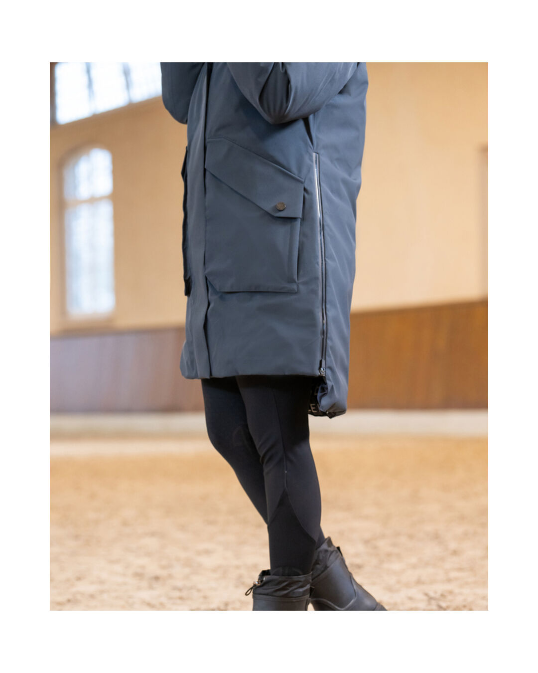 Gefertigt aus bi-elastischem, wasserdichtem Material mit feiner Struktur, sitzt der Mantel bequem und lässt dir volle Bewegungsfreiheit – egal ob beim Misten, Reiten oder im Stall. Der gerade Schnitt ist hinten etwas länger gehalten und reicht bis zum Knie – das sorgt für extra Schutz und einen modernen Look. Die Fibreball-Füllung sorgt für ein softes Tragegefühl mit hoher Wärmeleistung, während das Graphene Heating Storage-Futter im Rücken die Wärme speichert – ideal für frostige Wintertage.