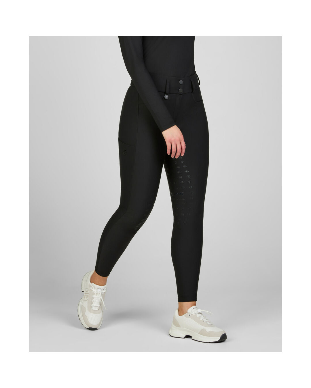 Der Siebdruck-Besatz im Pikeur Athleisure Design gewährleistet optimalen Halt im Sattel. Der breite Oberstoffbund mit zwei Bundverschlüssen sorgt für Stabilität und Komfort, während die runden Einschubtaschen praktische Aufbewahrungsmöglichkeiten bieten. Die Handytasche am Seitenstreifen und das stilvolle Pikeur Athleisure-Printing am Beinabschluss sowie unterhalb des Bundes runden das Gesamtbild ab.