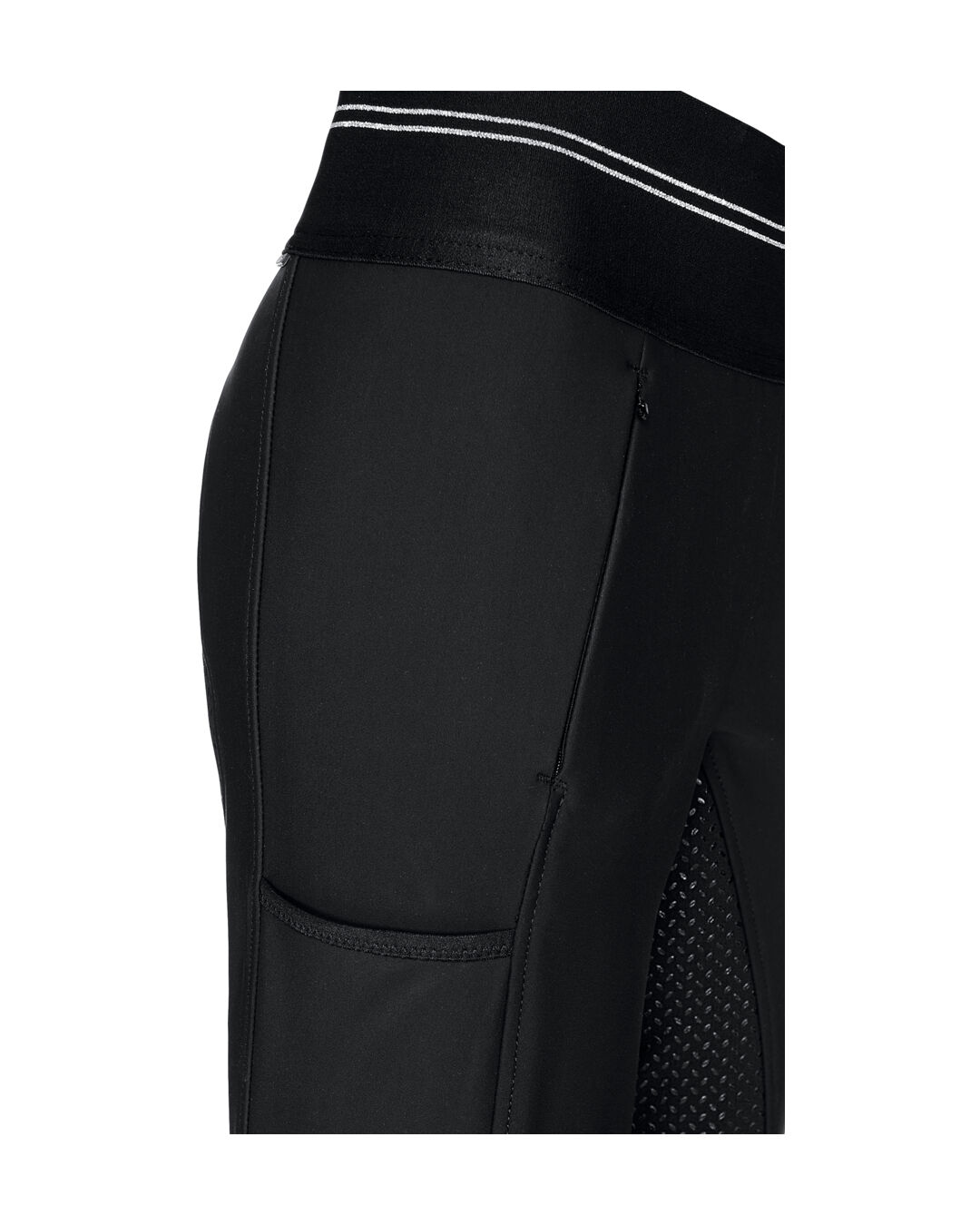 Eine absolut bequeme Reithose aus super elastischer Funktionsware mit samtigem Griff und softer Innenseite, die eine gute Schweiß-Absorption gewährleistet. Durch den hohen Bund und das super elastische Material hat die Reithose eine perfekte Passform bei höchstem Tragekomfort. Für einen sicheren und rutschfesten Halt im Sattel ist der 3/4-Grip-Gesäßeinsatz verantwortlich und das elastische Ripband am Beinabschluss aus Oberstoff erleichtert dir das An- und Ausziehen. Sehr dezent und praktisch sind die nahtverdeckten Reißverschluss-Taschen. Der breite, elastische Bund mit Lurex-Streifeneinwebung engt dich nicht ein und ist top modisch, während die große Handytasche am Oberschenkel das Handy immer griffbereit hält.