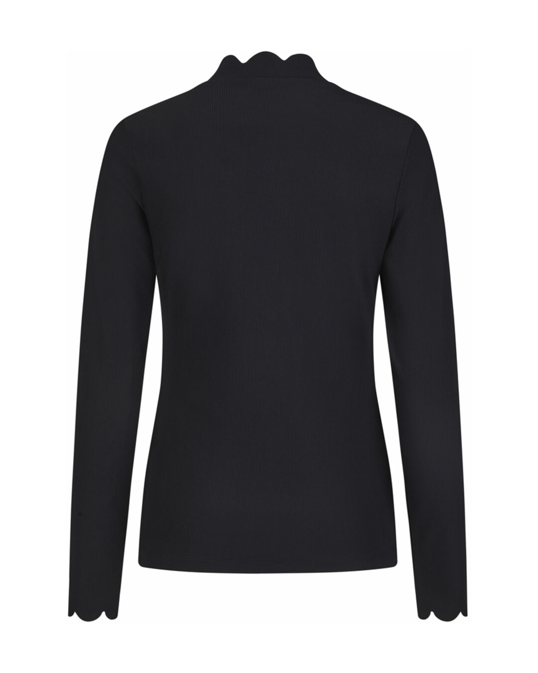 Die feine Rippoptik sorgt für eine moderne, sportliche Note, während die Innenseite leicht angeraut ist – angenehm weich und ideal für kühlere Tage. Der kleine, gewellte Stehkragen bringt einen Hauch Eleganz ins Spiel, ohne overdressed zu wirken. Genauso wie die wellenförmigen Armabschlüsse, die dem Shirt eine charmante Leichtigkeit verleihen.
