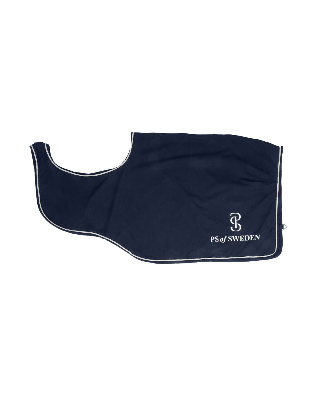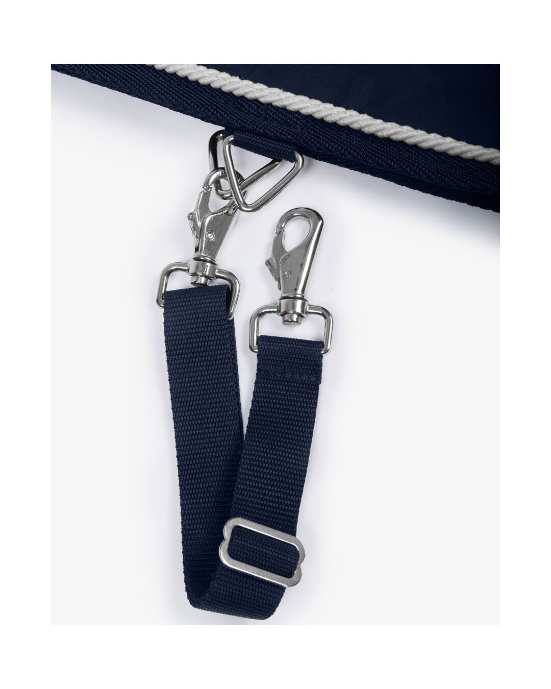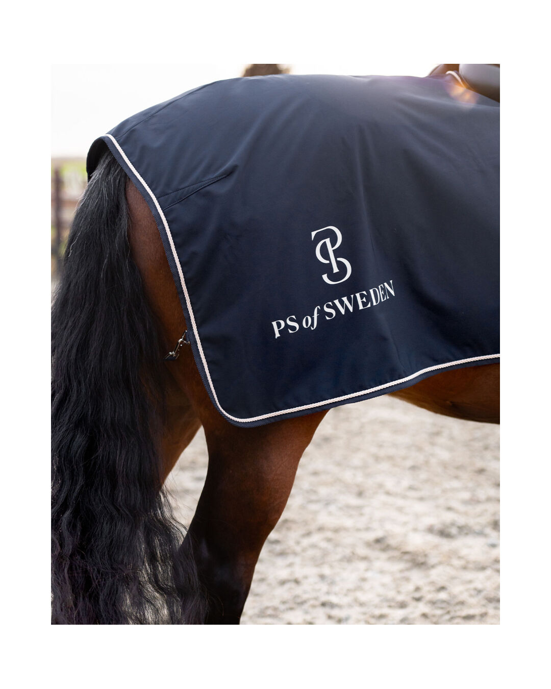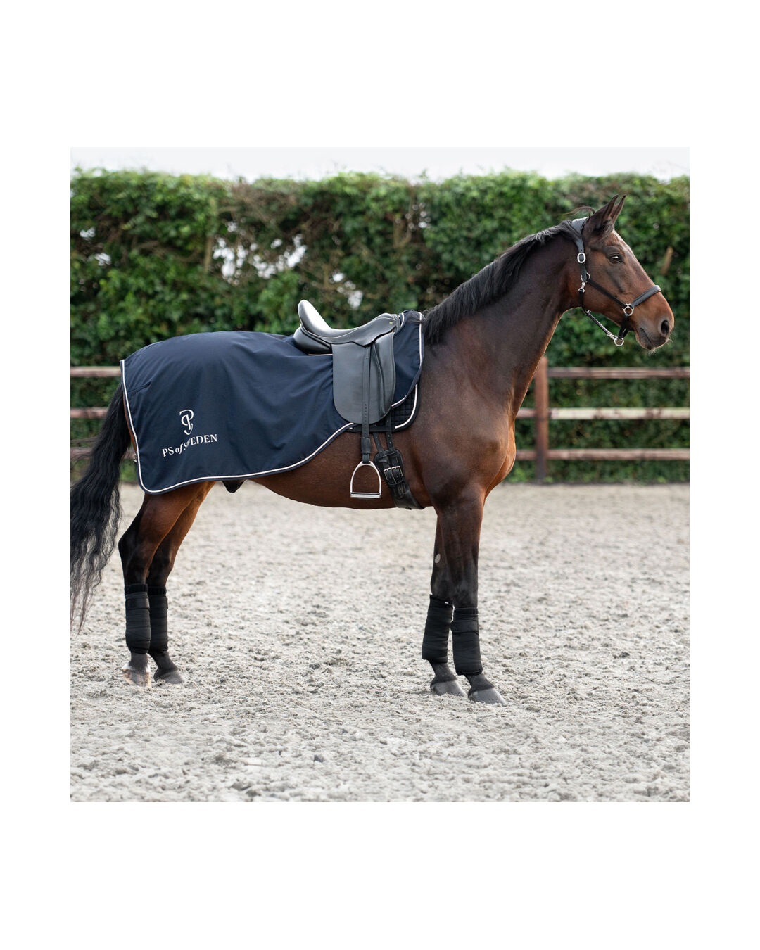 Das weiche Gewebe bietet hervorragende feuchtigkeitsableitende Eigenschaften. Eine Klettverschlusslasche oben sowie ein verstellbarer Schweifriemen mit zwei Karabinerhaken, sorgen für sicheren Halt. Der cremefarbene PS-Monogrammdruck auf beiden Seiten und die Offwhite-Fischgrätenbindung an allen Kanten runden die Decke optisch ab.