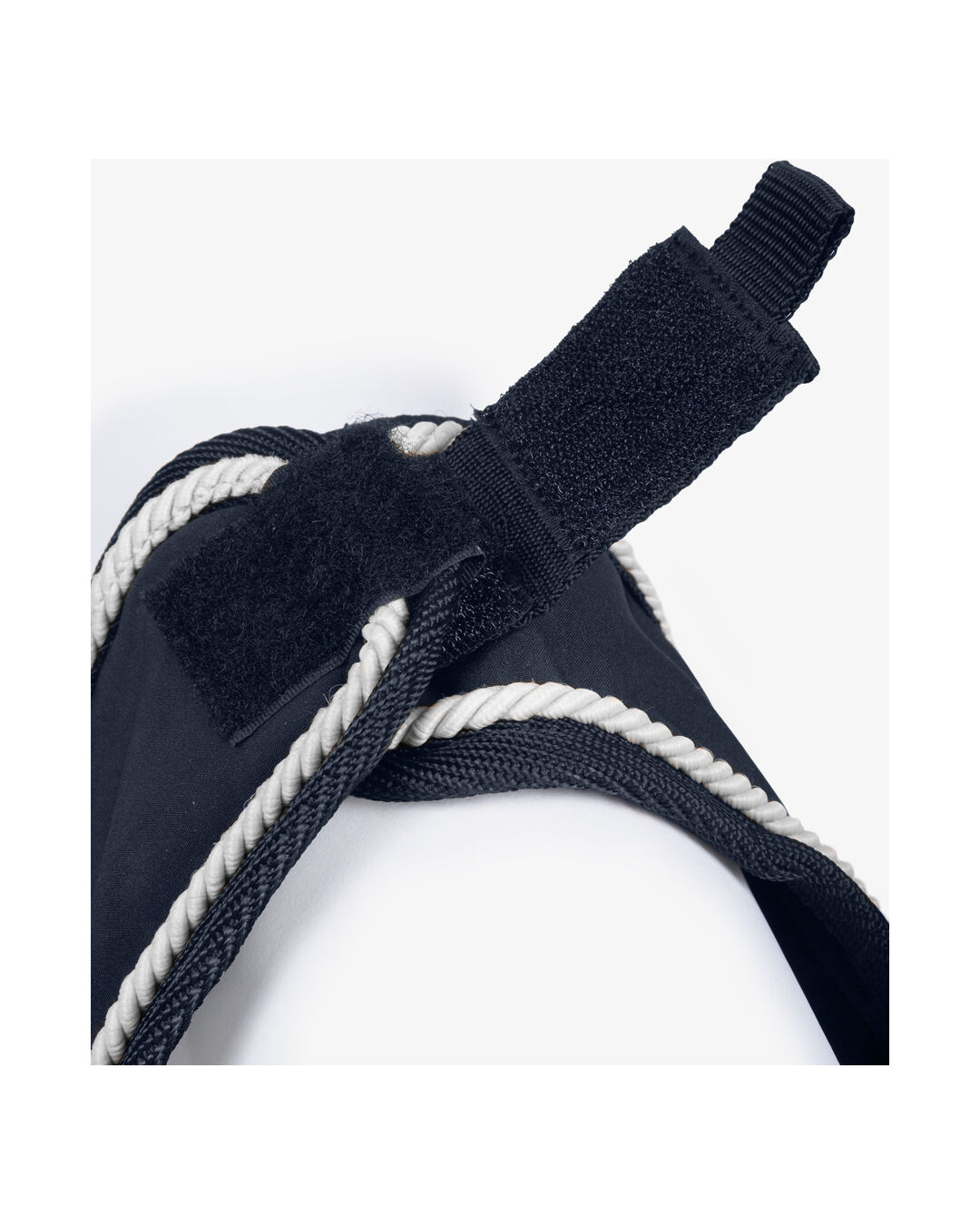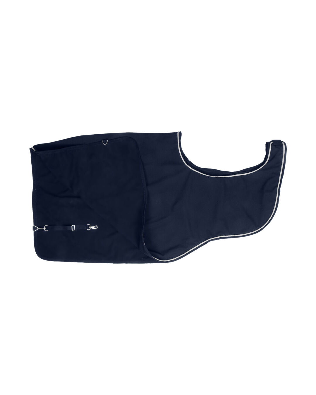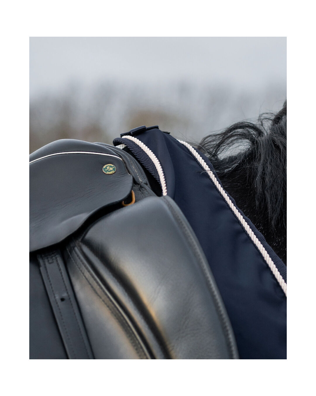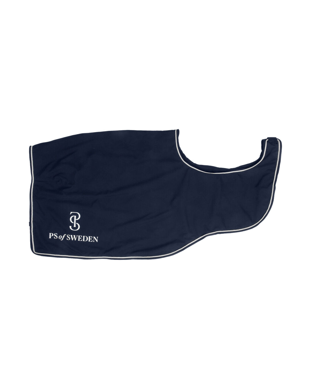 Das weiche Gewebe bietet hervorragende feuchtigkeitsableitende Eigenschaften. Eine Klettverschlusslasche oben sowie ein verstellbarer Schweifriemen mit zwei Karabinerhaken, sorgen für sicheren Halt. Der cremefarbene PS-Monogrammdruck auf beiden Seiten und die Offwhite-Fischgrätenbindung an allen Kanten runden die Decke optisch ab.
