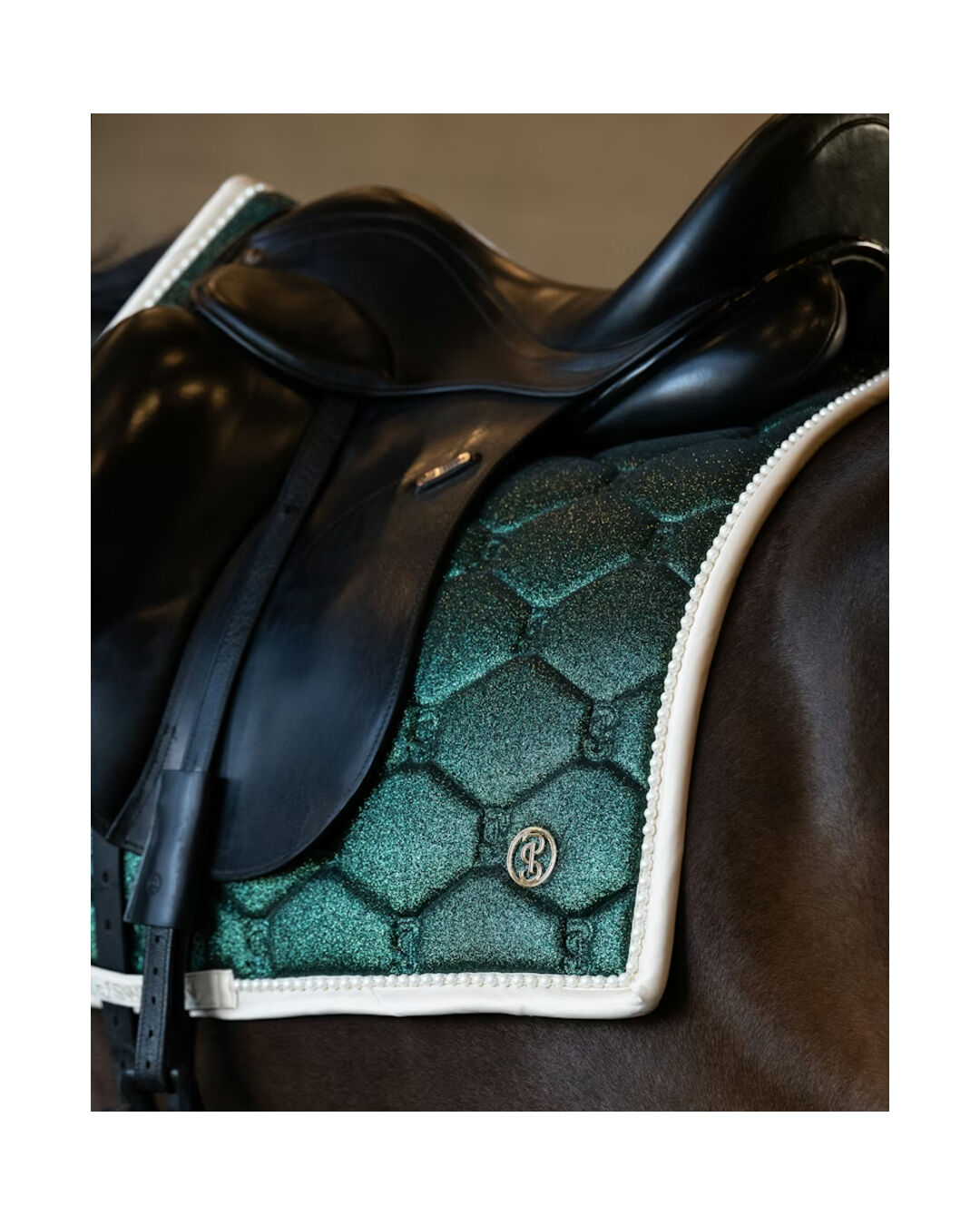Die anatomisch geformte Schabracke schmiegt sich optimal an den Rücken deines Pferdes an und bietet spürbare Widerristfreiheit. So liegt sie ruhig, ohne Druck auszuüben oder einzuengen. Das edle Glitzer-Obermaterial mit der charakteristischen PS-Steppung sorgt für einen eleganten Look, der im Viereck sofort ins Auge fällt.