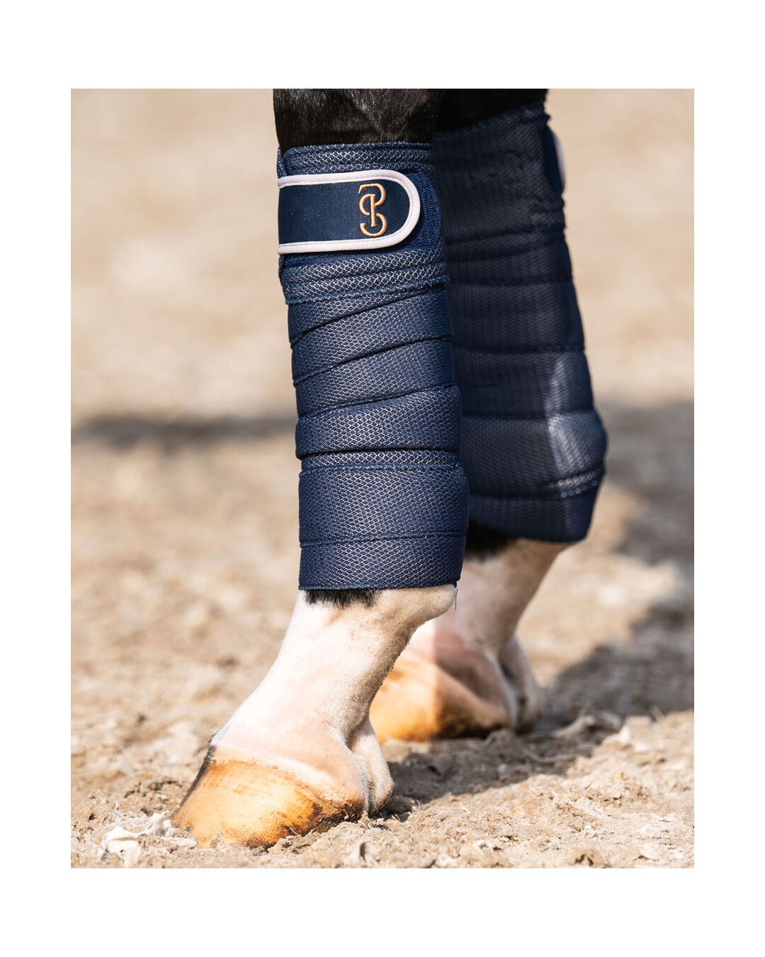 Die kontrastfarbene Lasche mit gesticktem Logo in dunklem Gold verleiht den Bandagen einen eleganten Look. Geliefert wird das Set als 2er-Pack mit einer Länge von jeweils 3 Metern – perfekt für eine vollständige Bandagierung der Vorder- oder Hinterbeine.