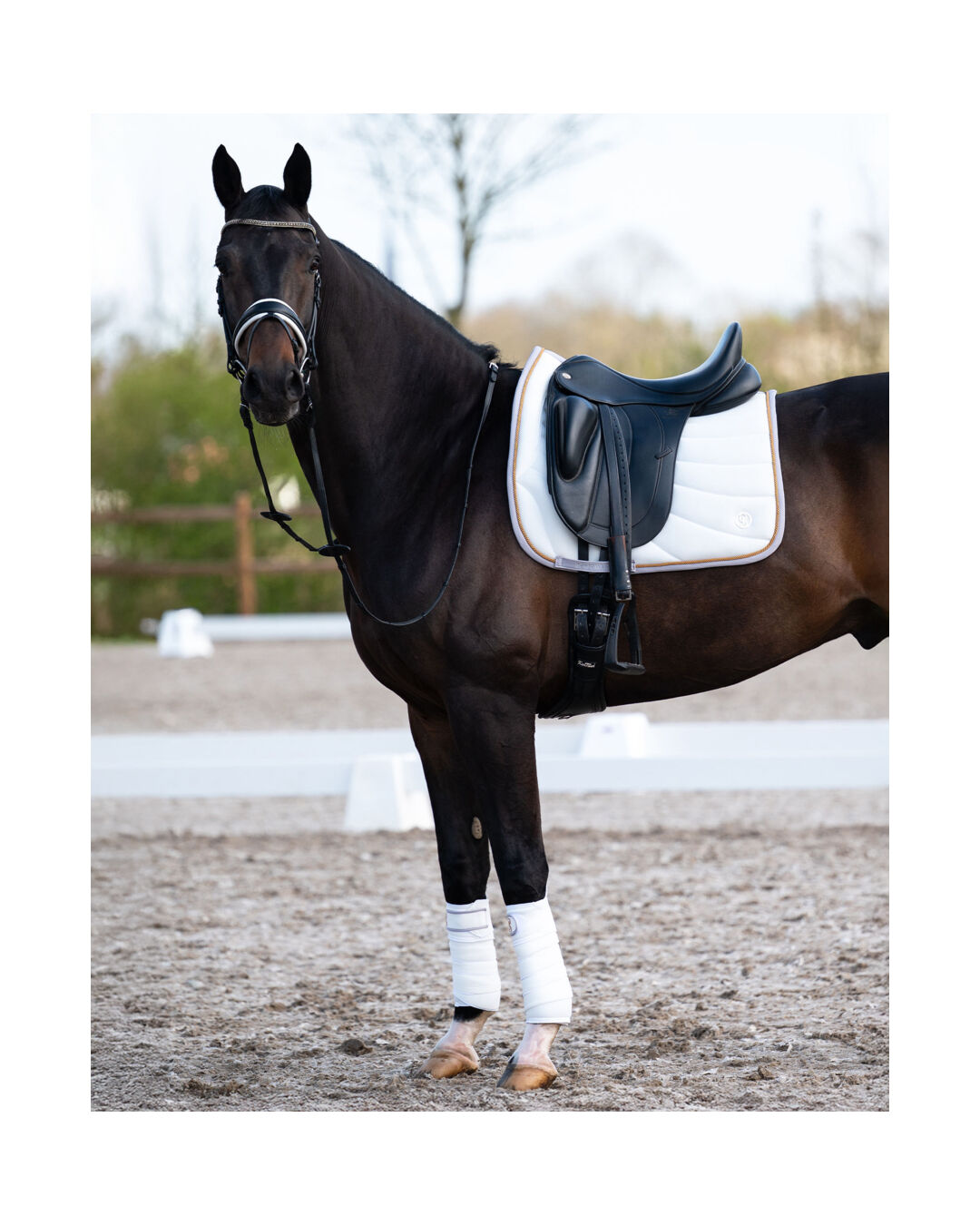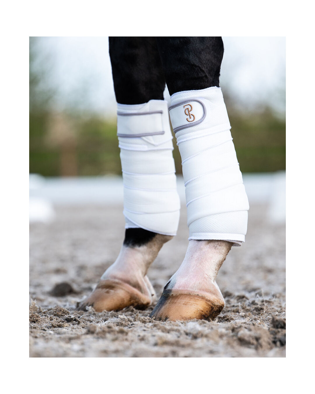 Die kontrastfarbene Lasche mit gesticktem Logo in dunklem Gold verleiht den Bandagen einen eleganten Look. Geliefert wird das Set als 2er-Pack mit einer Länge von jeweils 3 Metern – perfekt für eine vollständige Bandagierung der Vorder- oder Hinterbeine.