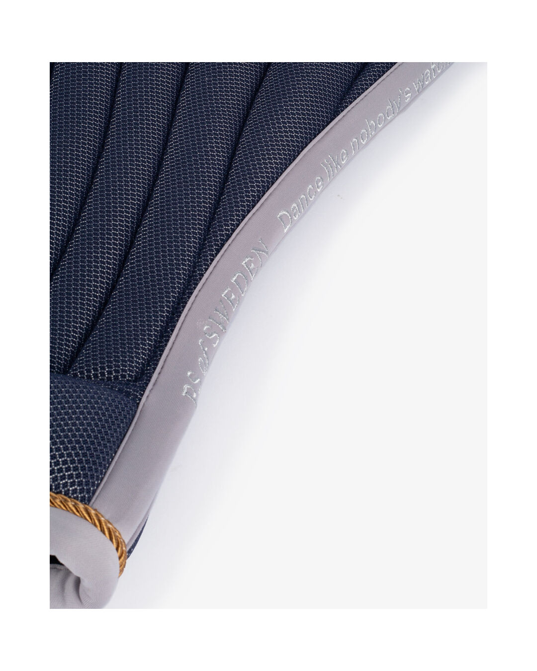 Die glatte, glänzende Oberfläche schützt vor Reibung am Sattel und beugt Kratzern vor. Ein weiches Mesh-Innenfutter lässt Luft und Dampf entweichen, sodass Feuchtigkeit schnell abtransportiert wird. Die kontrastfarbene Jersey-Bindung in Kombination mit der dunklen, goldfarbenen Zierkordel verleiht der Schabracke einen edlen Look. Entlang der Wirbelsäule findet sich ein dezentes, persönliches Zitat: Less is more.