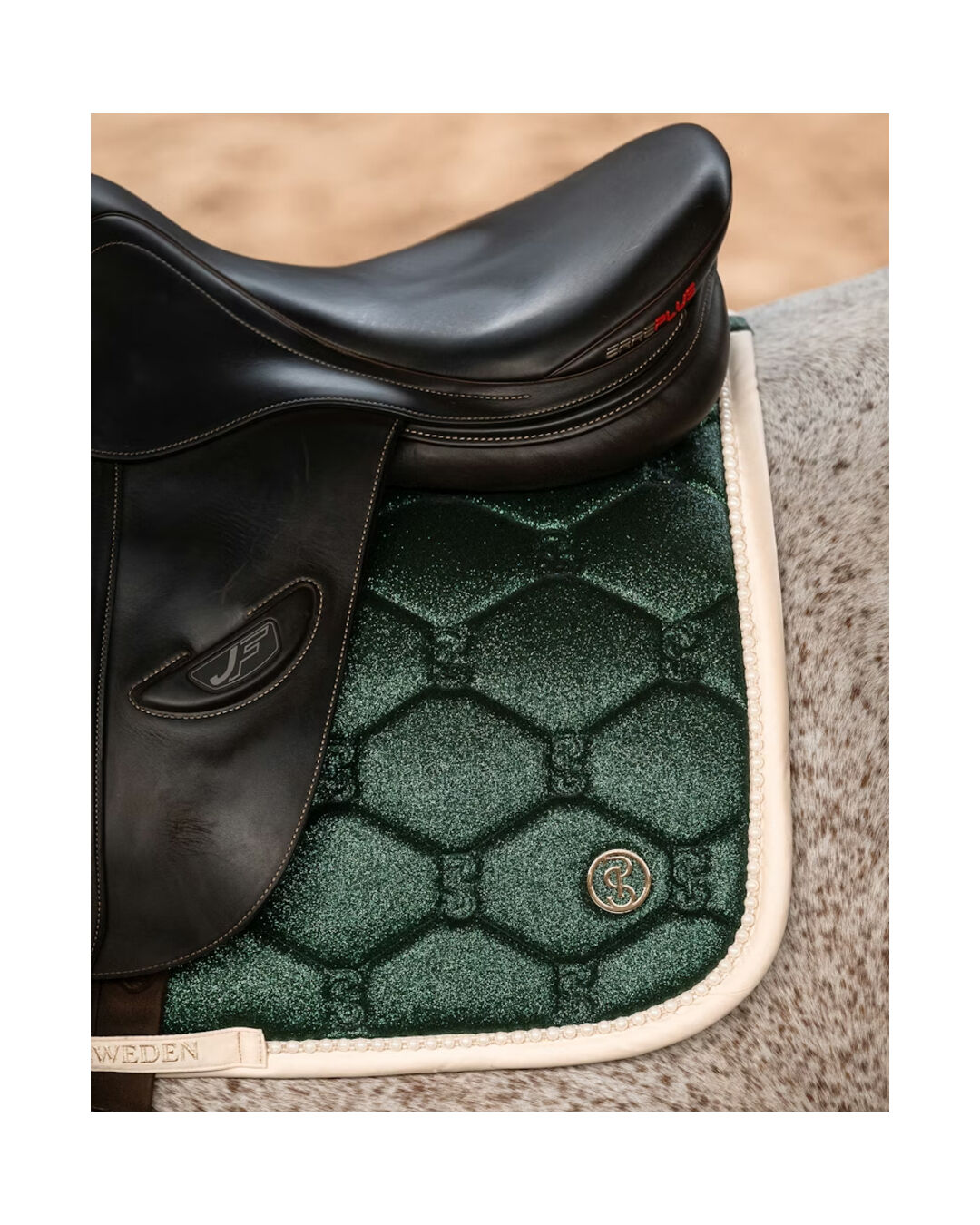 Die Springschabracke Stardust Pearl von PS of Sweden vereint sportliche Funktion mit einem edlen Look und sitzt dort, wo sie sitzen soll – ruhig, bequem und pferdegerecht.