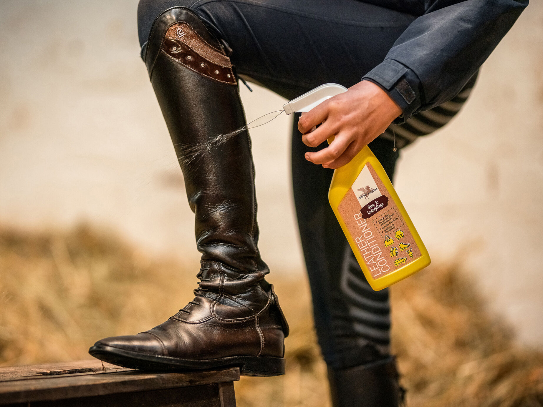 5. Wasserabweisende Sprays: Für Reitstiefel aus Leder oder Kunstleder können wasserabweisende Sprays verwendet werden, um sie vor Feuchtigkeit und Flecken zu schützen.