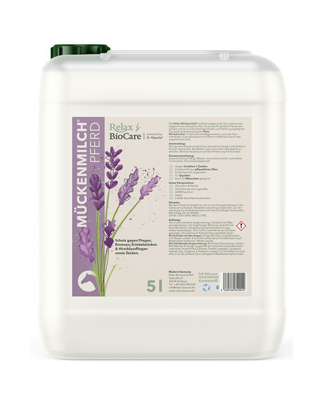 Die Mückenmilch von Relax-Biocare enthält ausgesuchte, fein aufeinander abgestimmte pflanzliche Öle. Sie wurde für sensible Pferde entwickelt und ist auch für trächtige Stuten und Fohlen gut geeignet. Die tägliche Anwendung der Mückenmilch unterstützt die Regeneration der Haut. Gute Akzeptanz von Pferd und Mensch durch den angenehmen Duft.