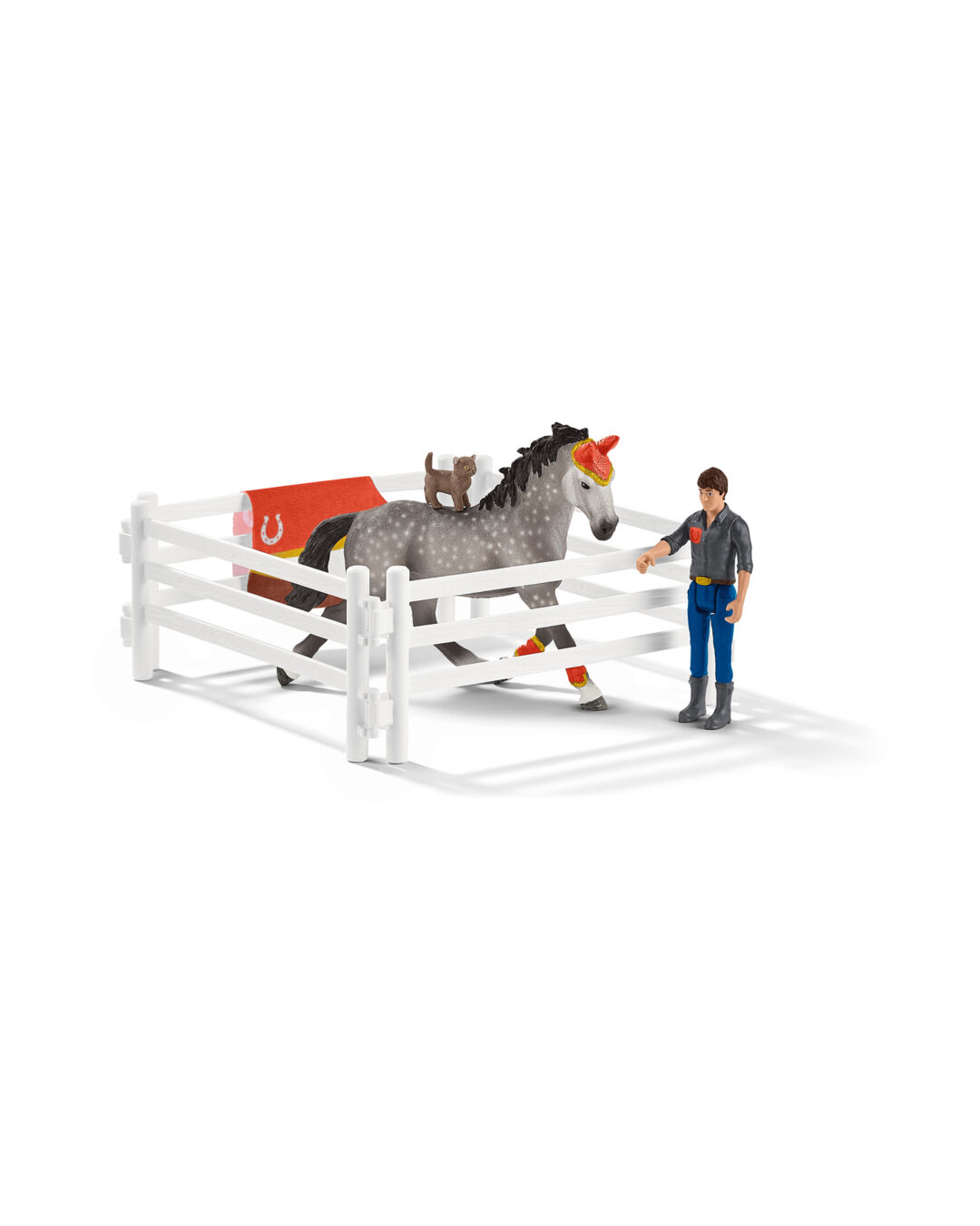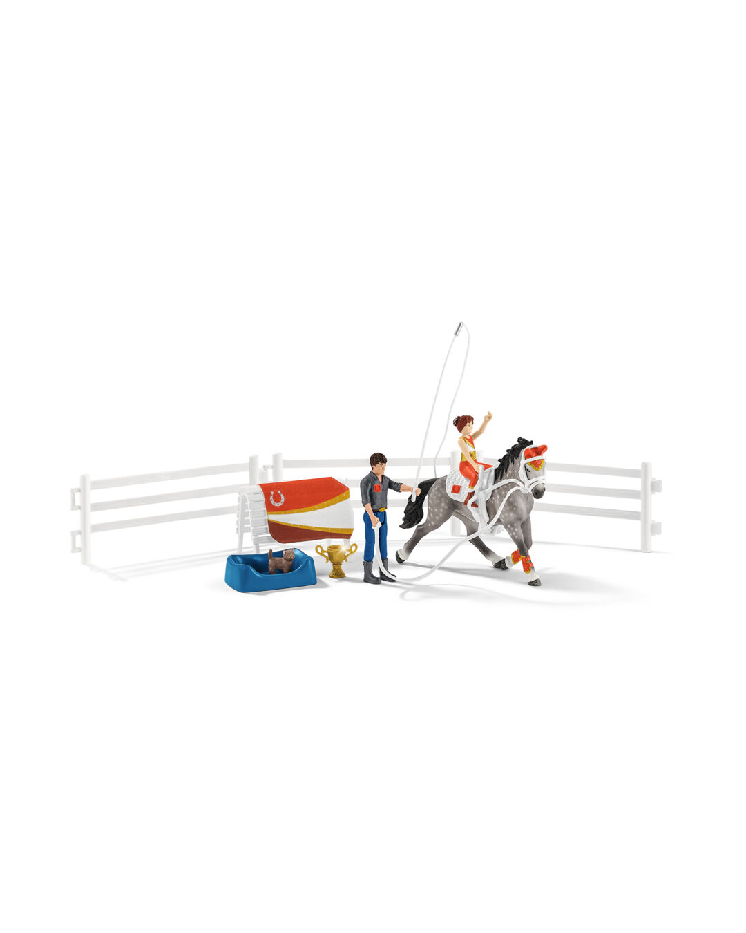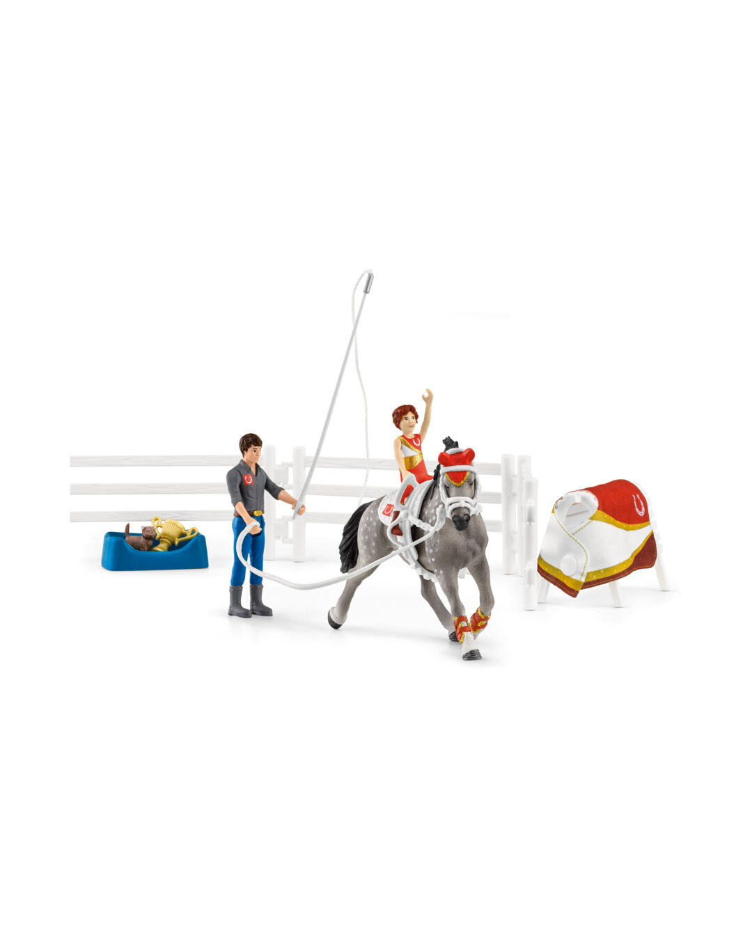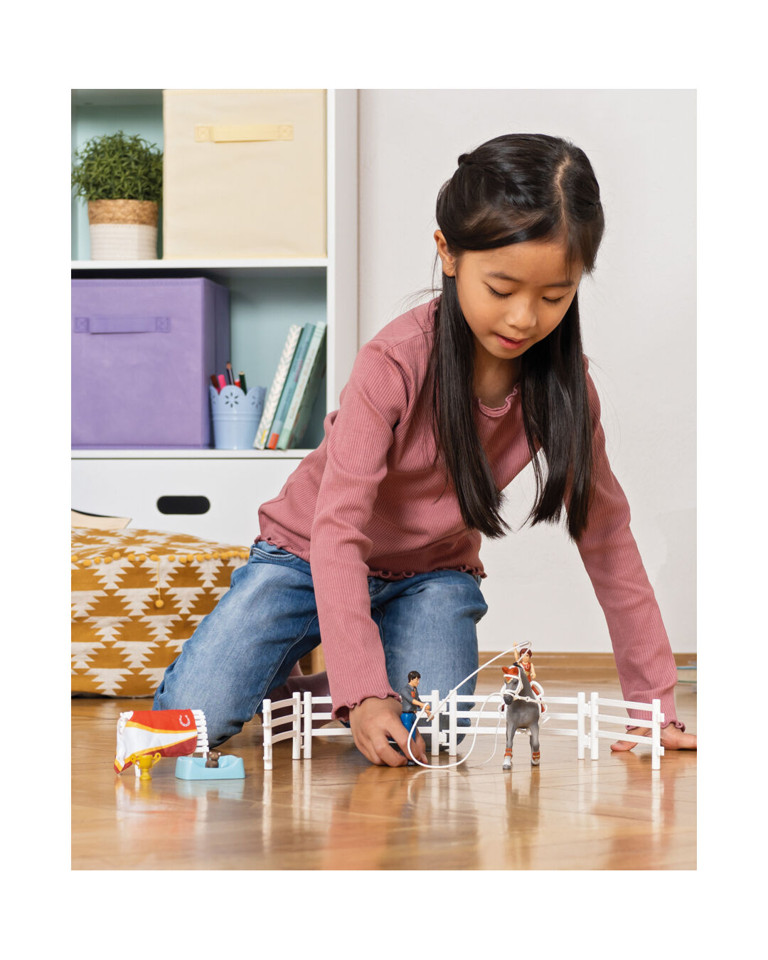 Das kleine Mädchen Mia trainiert mit Hilfe des Voltigier-Reitsets von schleich® HORSE CLUB intensiv für ihren ersten Wettbewerb. Der Reitlehrer Tom befestigt das Turnierpferd an der Voltigier-Longe und lässt die Peitsche sanft schnallen, damit das Pferd gleichmäßig im Kreis läuft. Die beliebig steckbaren Zaunteile sorgen für einen sicheren Trainingsbereich. Mia, mit ihren beweglichen Armen, kann sich festhalten und den großen goldenen Pokal entgegennehmen. Nach dem Training können Sattel, Zaumzeug und Decke abgenommen und auf der Deckenablage verstaut werden. Das braune Kätzchen beobachtet interessiert das Geschehen, während es sich gemütlich in sein Körbchen kuschelt.