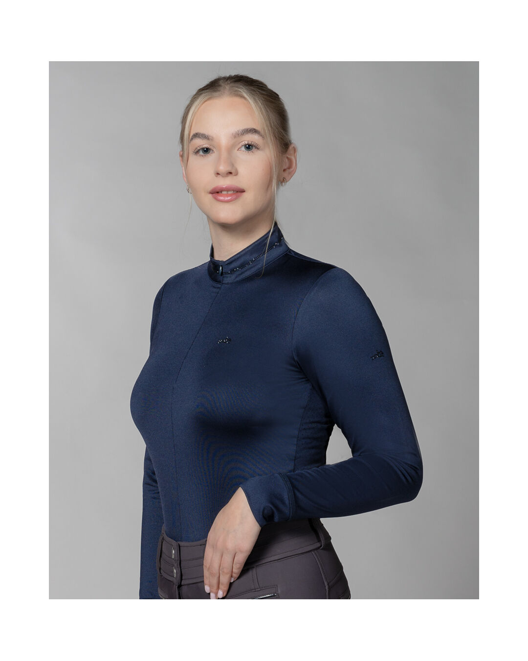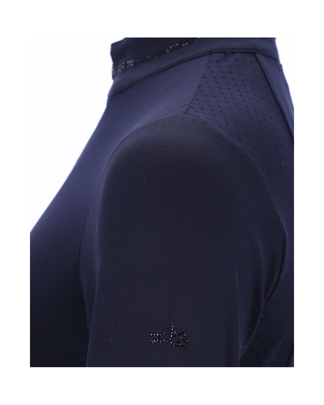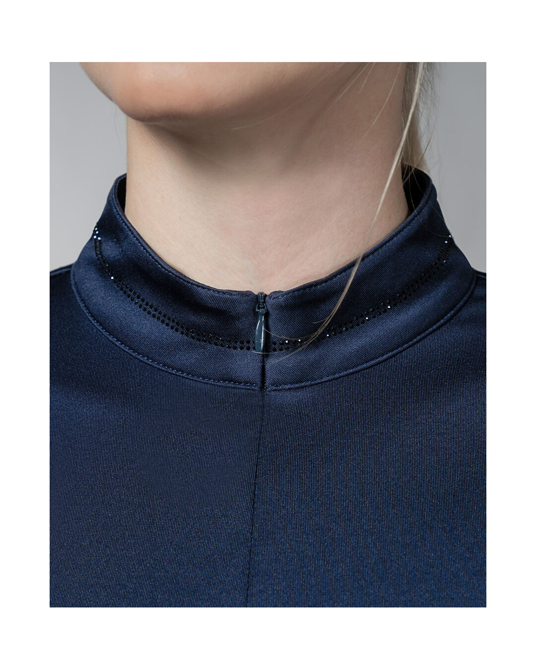 Ein besonderer Hingucker: Der Stehkragen ist mit Strasssteinen verziert, die dem Shirt eine elegante Note verleihen. Weitere Glitzer-Akzente am Rücken, am Ärmel und im Brustbereich runden den Look ab – subtil, aber wirkungsvoll.