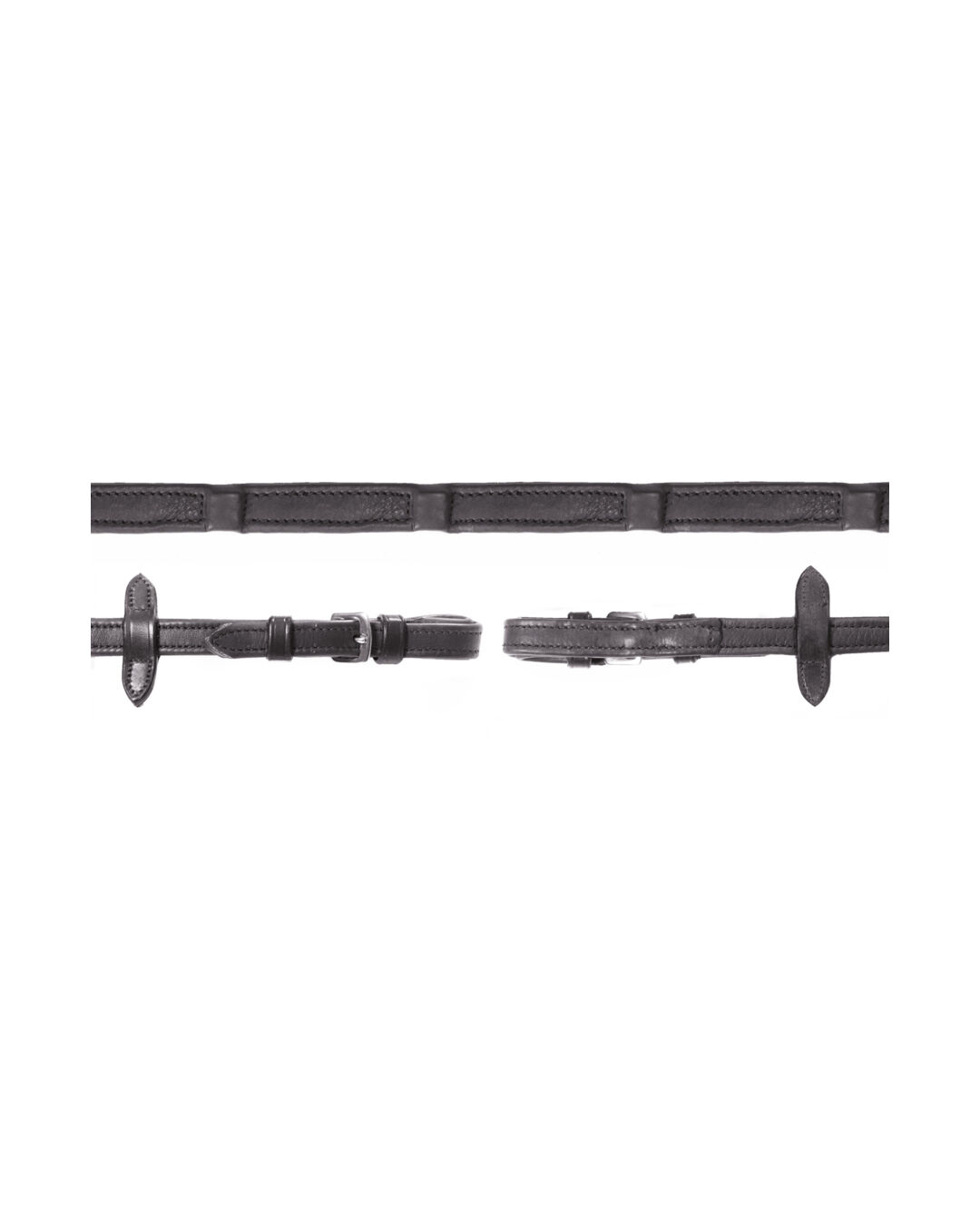 Diese innovativen Durasoft Reins von Schockemöhle Sports besitzen einen reißfesten Kern aus Nylon. Bis zur Gebissschlaufe ist ein reißfestes Gurtband eingelegt, bei dem das Kerngewebe vergleichbar ist mit dem Material von einem Sicherheitsgurt. Das verarbeitete Leder ist strapazierfähig aber auch extra-soft und geschmeidig. Eingearbeitete Stege sorgen für eine sicherere Lage in der Reiterhand. Der Zügel hat Martingalstopper und ist 16 mm breit.