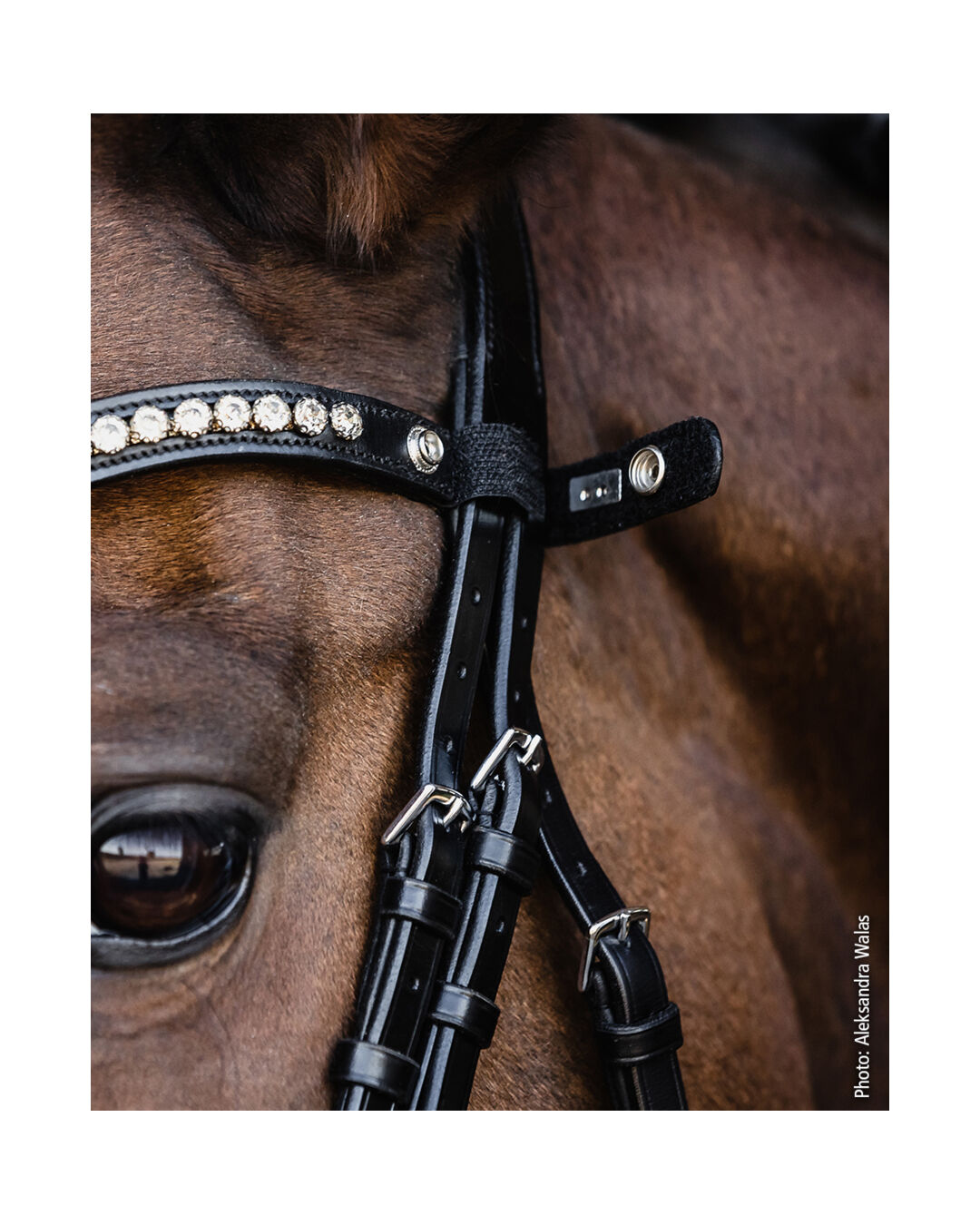 Ein besonderes Highlight ist das Stirnband mit großen Kristallen, das der Trense einen eleganten Look verleiht. Der Verschluss am Stirnband ermöglicht ein komfortables Austauschen, sodass du das Design nach Belieben anpassen kannst.