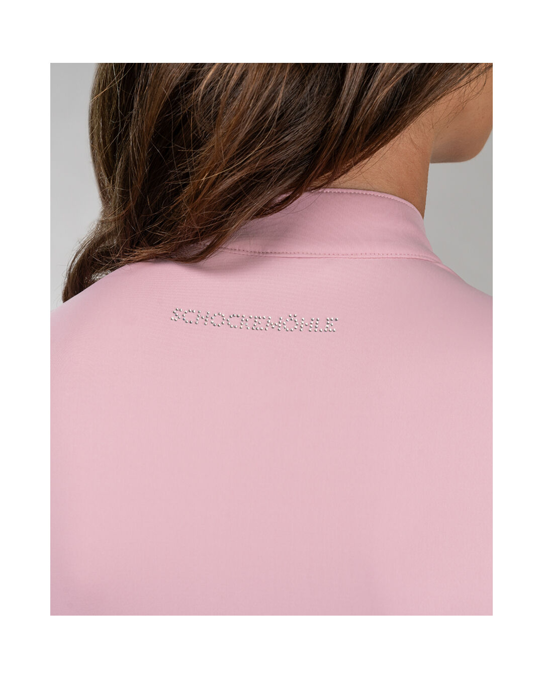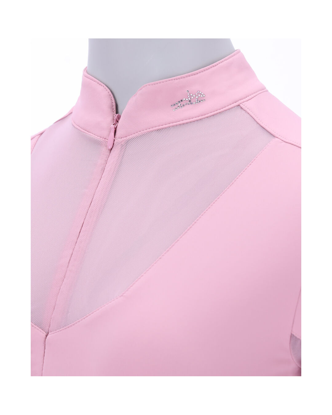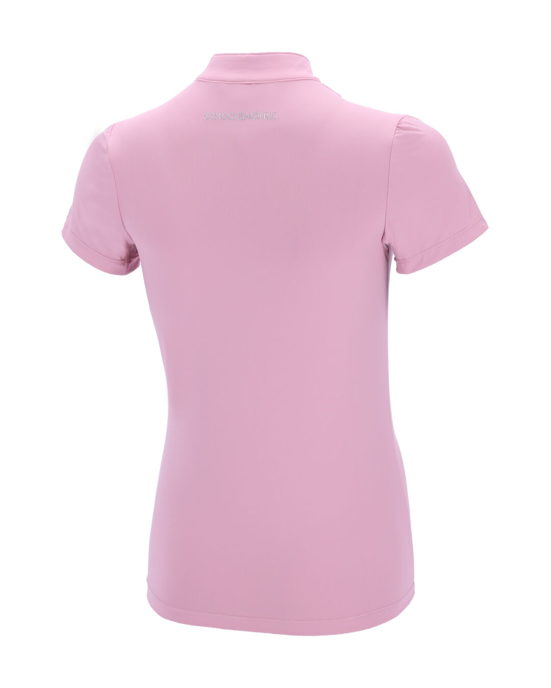 Der verdeckte Reißverschluss in der vorderen Mitte ermöglicht ein bequemes An- und Ausziehen, während der Stehkragen mit Strass-Motiv dem Shirt eine edle Optik verleiht. Ein weiteres Highlight sind die Logo-Strass-Motive auf dem oberen Rückenteil und dem linken Ärmel, die das Design glamourös abrunden.